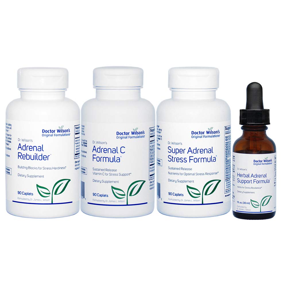 Dr. Wilson's Adrenal Fatigue Protocol includes Adrenal Rebuilder, Adrenal C Formula, Herbal Adrenal Support Formula, and Super Adrenal Stress Formula. These 4 adrenal support supplements work together to provide adrenal and daily stress support.