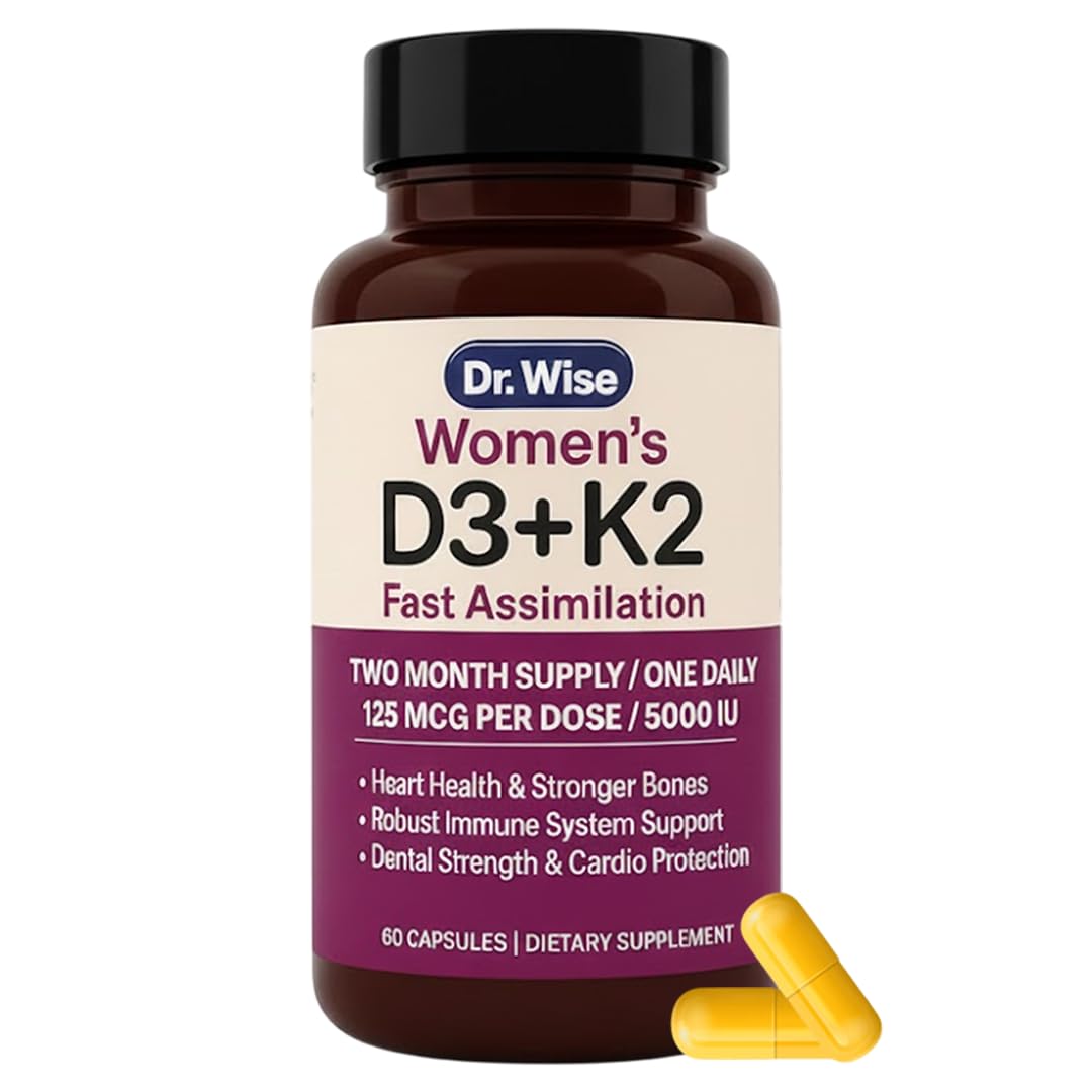Dr. Wise Women's D3 K2 is a high-absorption supplement designed to support women's health at every stage of life. Formulated with 5000 IU of Vitamin D3 and premium MK-7 K2, this once-daily capsule promotes bone strength, heart health, immune defense, and radiant skin.