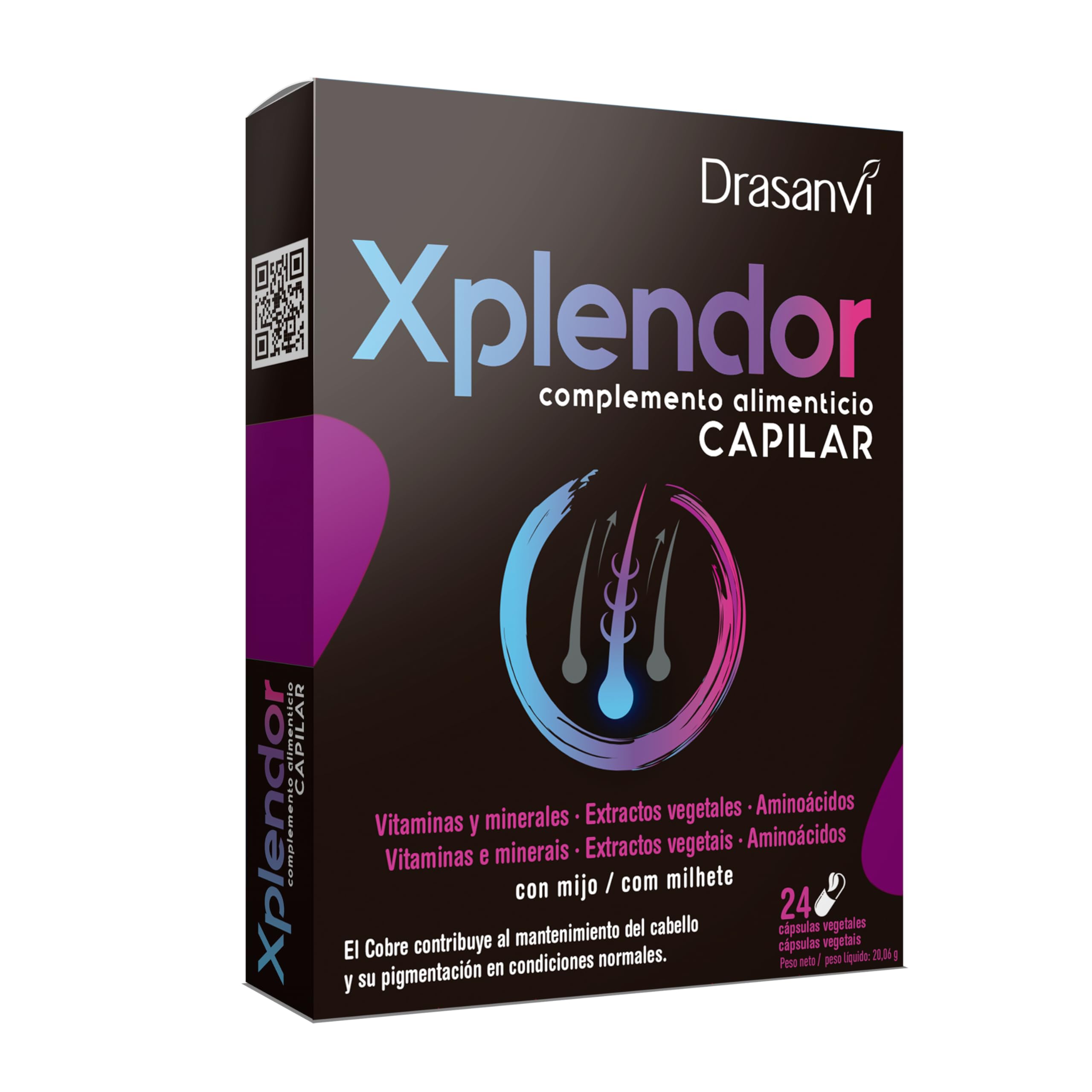 XPLENDOR HAIR 24 CAPSULES DRASANVI. Take care of your health with Drasanvi. Taking care has never been easier thanks to our products. INGREDIENTS Ingredients Amount Daily Dose Vitamin C as Ascorbic Acid 80 mg Iron as Iron Bisglinate 14 mg 70 mg Millet Dry Extract Panicum miliaceum L. with added fatty acids (1 ) 45 mg 0.45 mg Vitis vinifera L. var. Tincture Dry Extract with added polyphenols (50 ) 45 mg 22.5 mg Pumpkin Seed Dry Extract Cucurbita pepo L. with added fatty acids (85 ) 45 mg 38.25 mg dry extract of Ginkgo Ginkgo biloba L. with contribution in flavonoids (24 ) Ginkgo biloba L. with contribution in terpene lactones (6 ) 45 mg. 10.8 mg 2.7 mg Dry extract of Equisetum arvense L. horsetail with silica content (1 ) 45 mg. 0.45 mg Zinc as zinc gluconate 5 mg 35 mg L-methionine 35 mg L-cystine 35 mg L-taurine 35 mg L-lysine 35 mg L-leucine 35 mg Vitamin E as D-alpha-tocopherol 12 mg 24 mg Vitamin B3 as nicotinamide 16 mg VitaVita Vitamin A as retinol 800 µg 6.12 mg Vitamin B5 as calcium D-pantothenate 6 mg Vitamin B12 as cyanocarboxylic acid 2.5 µg 2.5 mg Vitamin D as cholecalciferol 5 µg 2.08 mg Vitamin K as meaquinone 75 µg 37.5 mg Vitamin B6 as pyridoxine hydrochloride 1.4 mg Vitamin B2 as Riboflavin 1.4 mg Vitamin B1 as thiamine hydrochloride 1.1 µg Copper as copper gluconate 0.15 mg 1.08 mg Biotin as D-biotin 2.00 µg Folic acid as pteroyl-L-glutamic acid 200 µg Selenium as sodium selenite 55 µg 120 µg Other ingredients: hydroxypropylmethylcellulose (coating agent), microcrystalline cellulose, magnesium stearate, and silicon dioxide. Sugar-free, ulcerative, coloring, and preservative-free. DIRECTIONS Take one capsule daily with water after breakfast. We recommend taking this product for three months, which corresponds to seasonal changes. Recommended daily dose: 1 capsule per day. SAFETY WARNING Store in a cool, dry place. See moreDirections for use: Take one capsule daily with water after breakfast. We recommend taking it for three months, adjusting the dosage to coincide with seasonal changes. Cosmetic, hair care. Vitamin C, iron, millet dry extract, red vine dry extract, ginkgo dry extract. PROPERTIES: Xplendor incorporates plant extracts with various active ingredients: among these extracts is millet extract. The extract used is in dry extract form, meaning it is five times more concentrated than the equivalent in powdered plant material. Benefits: Contributes to maintaining hair and its pigmentation under normal conditions. Advanced nutricosmetics to help care for your hair. Xplendor is a nutrient-rich supplement that strengthens hair and prevents breakage and hair loss. The treatment is complemented by Drasanvi Xplendor shampoo, formulated with plant extracts that strengthen the hair fiber and an innovative anti-hair loss system.DRASANVI XPLENDOR - Extraits végétaux Vitamines Minéraux - Renforce la fibre capillaire - 24 gélules végétalesDESCRIPTION DU PRODUIT DESCRIPTION DU PRODUIT XPLENDOR CAPILAIRE 24 CAPSULES DRASANVI. Prenez soin de votre santé par Drasanvi. Prendre soin n'a jamais été aussi facile grâce à nos produits. INGRÉDIENTS Ingrédients Quantité dose quotidienne Vitamine C sous forme d'acide ascorbique 80 mg Fer sous forme de bisglinate de fer 14 mg 70 mg Extrait sec de millet Panicum milliaceum L. avec apport d'acides gras (1 ) 45 mg . 0,45 mg Extrait sec de Vid Vitis vinifera L. var. teinture avec apport en polyphénols (50 ) 45 mg . 22,5 mg Extrait sec de graines de citrouille Curcubite pepo L. avec apport en acides gras (85 ) 45 mg . 38,25 mg extrait sec de Ginkgo Ginkgo biloba L. avec apport en flavonoïdes (24 ) Ginkgo biloba L. avec apport en lactones terpéniques (6 ) 45 mg . 10,8 mg 2,7 mg Extrait sec de queue de cheval Equisetum arvense L. avec apport en silice (1 ) 45 mg . 0,45 mg Zinc sous forme de gluconate de zinc 5 mg 35 mg L-méthionine 35 mg L-cystine 35 mg L-taurine 35 mg L-lysine 35 mg L-leucine 35 mg vitamine E sous forme de D-alpha-tocophérol 12 mg 24 mg vitamine B3 sous forme de nicotinamide 16 mg VitaVitaVitamine A en forme de rétinol 800 µg 6,12 mg Vitamine B5 sous forme de D-pantothénate de calcium 6 mg Vitamine B12 sous forme de cyanocabamine 2,5 µg 2,5 mg Vitamine D sous forme de cholécalciférol 5 µg 2,08 mg Vitamine K sous forme de méaquinone 75 µg 37,5 mg Vitamine B6 sous forme de pyridoxine Chlorhydrate 1,4 mg Vitamine B2 sous forme de riboflavine 1,4 mg Vitamine B1 sous forme de thiamine Chlorhydrate 1,1 µg Cuivre sous forme de gluconate de cuivre 0,15 mg 1,08 mg Biotine en forme D-biotina 2. 00 µg Acide folique sous forme d'acide ptéroyl-L-glutamique 200 µg Sélénium sous forme de sélénite de sodium 55µg 120 µg Autres ingrédients : hydroxypropylméthylcellulose (Agent de revêtement), cellulose microcristalline, magnésium stéarate et dioxyde de silicium sans sucres, ulcorants, colorants ni conservateurs MODE D'EMPLOI Prendre une capsule par jour, accompagnée d'eau, après le petit déjeuner. Nous recommandons sa consommation pendant trois mois, ce qui correspond aux changements saisonniers. Dose journalière recommandée : 1 capsule par jour AVERTISSEMENT DE SÉCURITÉ Conserver dans un endroit frais et sec. Voir plusMode d'utilisation : prendre une capsule par jour, accompagnée d'eau après le petit-déjeuner. Nous recommandons sa consommation pendant trois mois, en la faisant correspondre aux changements saisonniers. Cosmetique, cheveux. Vitamine C, fer, extrait sec de millet, extrait sec de vigne rouge, extrait sec de ginkgo. PROPRIÉTÉS: Xplendor intègre des extraits végétaux avec différents principes actifs : parmi ces extraits est l'extrait de millet. L'extrait utilisé est sous forme d'extrait sec, c'est-à-dire multiplie par 5 son équivalence en plante pulvérisée. Avantages : contribue au maintien des cheveux et à leur pigmentation dans des conditions normales. Nutricosmétique avancée pour aider à prendre soin de vos cheveux. Xplendor est un supplément riche en nut