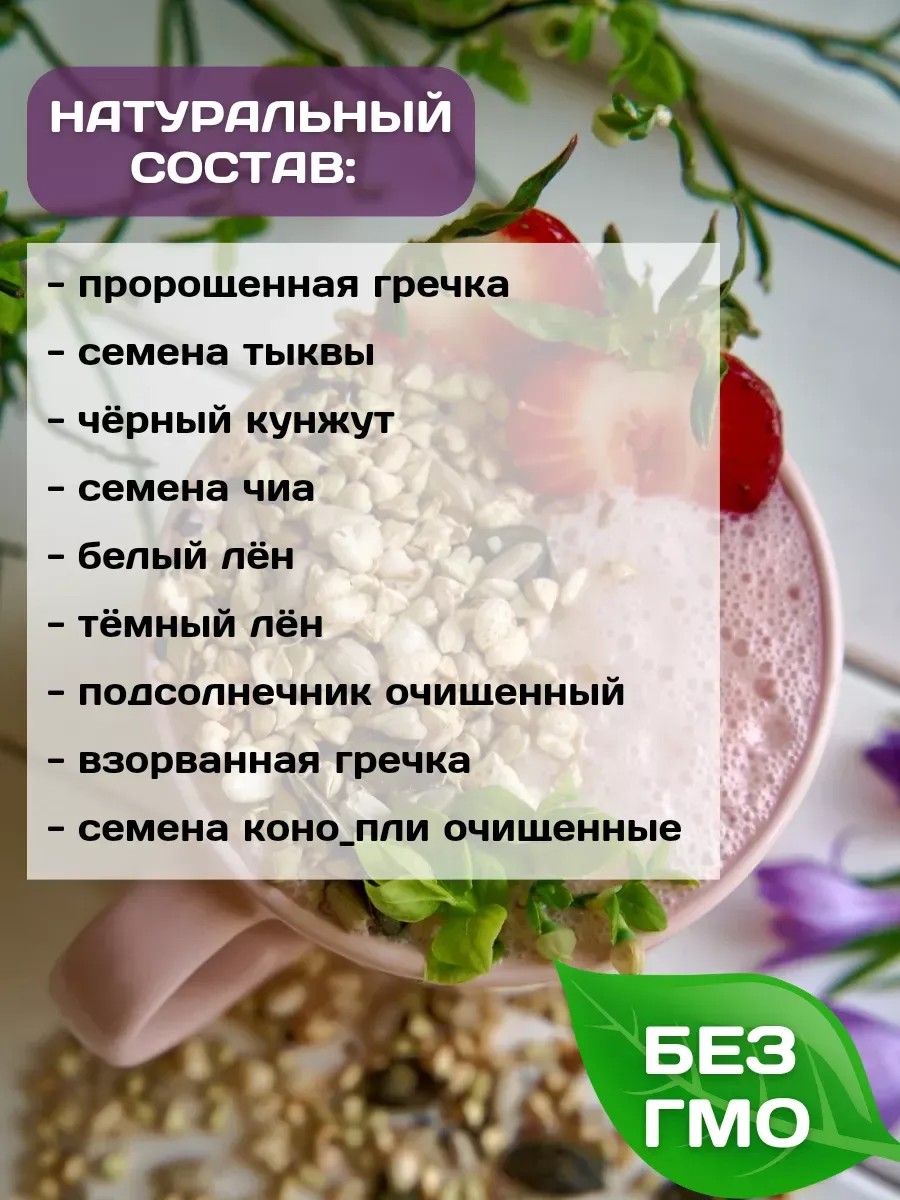 How pleasant it is to wake up in the morning and head to the kitchen, where a healthy breakfast of green buckwheat, packed with vitamins and minerals, awaits you. Our experts have selected the seven most nutrient-rich seeds—chia, flax, and hemp—to help replenish essential omega-3 fatty acids. Styrian pumpkin and sunflower seeds will cleanse digestion, improve the condition of your skin, nails, and hair, while black sesame seeds impart a vibrant aroma and enhance the flavor of this combination. Rest assured, this combination will definitely make you slimmer and keep you full 365 days a year! After such a healthy, quick breakfast, you'll want to go for a run and accomplish all your daily plans! It's nice when dietary food is also delicious and healthy. Lenten food that's suitable for Lent. Great Lent. Nastin Slastin ready-made cereal is a healthy menu and a highly versatile product that's beneficial for the intestines. It's a dietary meal, a quick snack, a diabetic product, a healthy breakfast product, and a fitness and fit breakfast cereal. It's also suitable as a weight-loss menu and as a vegan product. Directions: 30-36 grams of cereal (2-3 tablespoons), 200 grams of yogurt or fermented baked milk, or milk or juice. You can add any healthy ingredients, such as sliced fruit. Fruit and berries also make a beautiful presentation. This healthy breakfast can also be added to cottage cheese, porridge, and baked goods. This ready-made breakfast set contains a large amount of vitamins, minerals, amino acids, and antioxidants. It's a sugar-free snack and a healthy and tasty healthy meal. Important! Frequent consumption of this gluten-free breakfast promotes unprecedented immune system improvement. See the results for yourself!