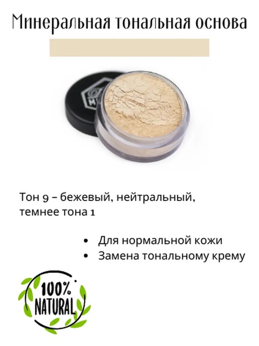 Минеральная основа для нормальной кожи имеет плотное покрытие и подходит для нормальной и склонной к жирности коже. Она прекрасно матируют, впитывает излишки жира и маскирует недостатки кожного покрова. Шелковая пудра в ее составе создает эффект сияния изнутри и делает кожу бархатистой. Основы прекрасно садятся на лицо, делая макияж естественным и очень легким. При необходимости, под основу можно нанести праймер, для лучшего контроля над жирным блеском.Имеют солнцезащитный фактор SPF 15.Состав: Mica, Titanium dioxide, Iron oxides, Silk Powder, zinc oxide, Magnesium Mysistate.