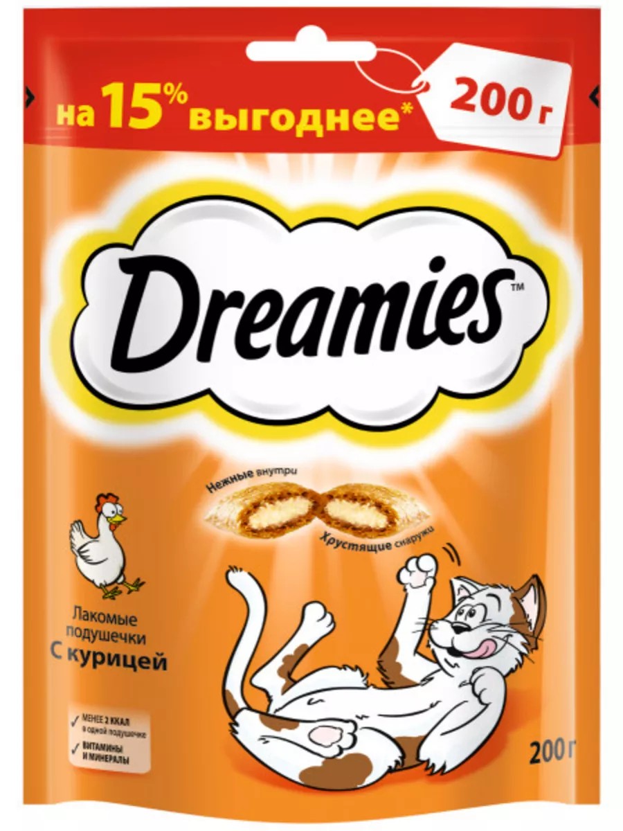 Dreamies лакомство для кошек, подушечки c курицей ( 8шт в уп) 200 гр. Незабываемая нежная курочка в хрустящей вкусной подушечке -это достойная награда вашему любимому зверю. Теперь ему не нужно охотиться, стоит только открыть упаковку, и курочка никуда не убежит! В состав Dreamies Лакомые Подушечки входят важные для кошки питательные вещества, витамины и минералы, а значит, такое угощение приносит не только радость, но и пользу.