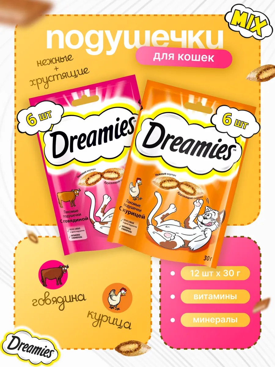 Если хотите порадовать любого пушистого друга — лакомства DREAMIES подойдут для кошек и котов всех пород и размеров! В упаковке два вкуса, каждый со своими особенностями: