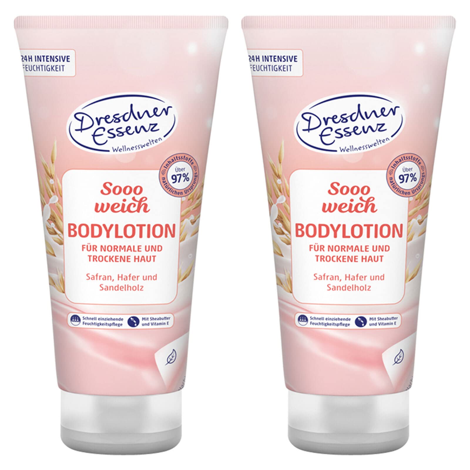 "Sooo Soft" body lotion contains 200 ml. The vegan soap with an oriental woody scent is relaxing and soothing and ensures supple skin. Vegan liquid soap with a moisturizing complex based on almond oil, cocoa butter, shea butter, sunflower oil, vitamin E, Allantoin, glycerin noticeably nourishes the hands when washing hands and leaves a pleasant, smooth feeling on the skin. Liquid soap for dry skin is suitable for frequent hand washing. The body lotion caresses the body and soul and moisturizes dry skin. Dresdner Essenz hand care products are suitable as body cream for dry skin, body cream, body lotion for women, body cream for women or body care for dry skin. Ingredients: Aqua, Prunus Amygdalus Dulcis Oil, Theobroma Cacao Seed Butter, Butyrospermum Parkii, Glycerin, Isopropyl Palmitate, Cetearyl Alcohol, Glyceryl Stearate Citrate, Glyceryl Stearate, Distarch Phosphate, Parfum, Amyris Balsamifera Bark Oil, Tocopherere yl Acetate. Allantoin, lactic acid, tocopherol, helianthus annous seed oil, xanthan gum, carrageenan, sodium polyphosphate, benzyl alcohol, dehydroacetic acid, sodium benzoate, geraniol, linalool, citronellol, alpha-isomethyl ionone. Natural ingredients: almond oil, cocoa butter, shea butter, sunflower oil, West Indian sandalwood oil. Essential oils: West Indian sandalwood oil. Care ingredients: almond oil, cocoa butter, shea butter, sunflower oil, vitamin E, Allantoin, glycerin.Dresdner Essenz care products are suitable as skin care for dry skin, women's body lotion, women's body cream, women's body lotion, body cream, or as a gift idea. The Sooo Soft body cream is relaxing and soothing, cares for the skin, and protects it from drying out. The vegan body milk with an oriental woody scent ensures supple skin. The skin cream nourishes stressed skin with a moisture complex of almond oil, cocoa butter, shea butter, sunflower oil, vitamin E, allantoin, and glycerin. The body lotion caresses body and mind and moisturizes dry skin. The "Sooo Soft" body lotion contains 200 ml and is suitable for sensitive skin. Pack of 2. La lotion pour le corps « Sooo Soft » contient 200 ml. Le savon végétalien au parfum boisé oriental est relaxant et apaisant et assure une peau souple. Le savon liquide végétalien avec un complexe hydratant à base d'huile d'amande, de beurre de cacao, de beurre de karité, d'huile de tournesol, de vitamine E, d'allantoïne, de glycérine nourrit sensiblement les mains lors du lavage des mains et laisse une sensation agréable et lisse sur la peau. Le savon liquide pour peaux sèches convient au lavage fréquent des mains. La lotion pour le corps caresse le corps et l'esprit et hydrate la peau sèche. Les produits de soin pour les mains Dresdner Essenz conviennent comme crème corporelle pour les peaux sèches, crème pour le corps, lotion pour le corps pour femme, crème pour le corps pour femme ou soin du corps pour les peaux sèches. Ingrédients : Aqua, Prunus Amygdalus Dulcis Oil, Theobroma Cacao Seed Butter, Butyrospermum Parkii, Glycerin, Isopropyl Palmitate, Cetearyl Alcohol, Glyceryl Stearate Citrate, Glyceryl Stearate, Distarch Phosphate, Parfum, Amyris Balsamifera Bark Oil, Tocopherere Acétate de yle. Allantoïne, acide lactique, tocophérol, huile de graines d'hélianthus annous, gomme xanthane, carraghénane, polyphosphate de sodium, alcool benzylique, acide déshydroacétique, benzoate de sodium, géraniol, linalool, citronellol, alpha-isomethyl ionone. Ingrédients naturels : huile d'amande, beurre de cacao, beurre de karité, huile de tournesol, huile de bois de santal des Indes occidentales. Huiles essentielles : huile de bois de santal des Indes occidentales. Ingrédients de soin : huile d'amande, beurre de cacao, beurre de karité, huile de tournesol, vitamine E, allantoïne, glycérine.Dresdner Essenz Les produits de soin conviennent comme soin de la peau pour les peaux sèches, lotion pour le corps pour femme, crème pour le corps pour femme, lotion pour le corps pour femme, crème pour le corps ou idée cadeau. La crème corporelle Sooo douce est relaxante et relaxante, prend soin de la peau et la protège du dessèchement. Le lait corporel végétalien au parfum boisé oriental assure une peau souple. La crème pour la peau nourrit les peaux sollicitées avec un complexe hydratant composé d'huile d'amande, de beurre de cacao, de beurre de karité, d'huile de tournesol, de vitamine E, d'allantoïne, de glycérine. La lotion pour le corps caresse le corps et l'esprit et hydrate la peau sèche. La lotion pour le corps « Sooo Soft » contient 200 ml et convient aux peaux sensibles. Lot de 2.