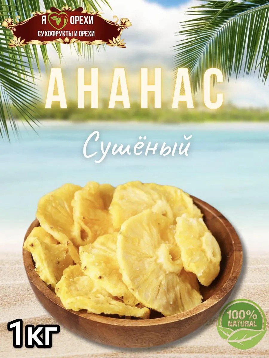 Ананас сушеный натуральный 1000гр/500гр. Ананас — при упоминании этого фрукта возникает приятное предвкушение пикантной сладости с приятной кислинкой. Это отличный полезный перекус и вкусный снек для тех, кто заботится о своем здоровье. Сушеный ананас — лёгкий и удобный вариант перекуса, который можно брать с собой в дорогу или на работу. А ещё это уверенность в том, что при регулярном употреблении вы станете ещё красивее и легче на подъём, ведь это самая популярная добавка для желающих похудеть или просто оставаться в прекрасной форме. Питательная ценность ананаса уникальна. Никакой другой плод не имеет такого интересного состава, его даже называют "тропической аптекой". Здоровое питание каждый день — это просто! Он важен для здоровья волос и ногтей, укрепляет стенки сосудов, улучшает состояние суставов.