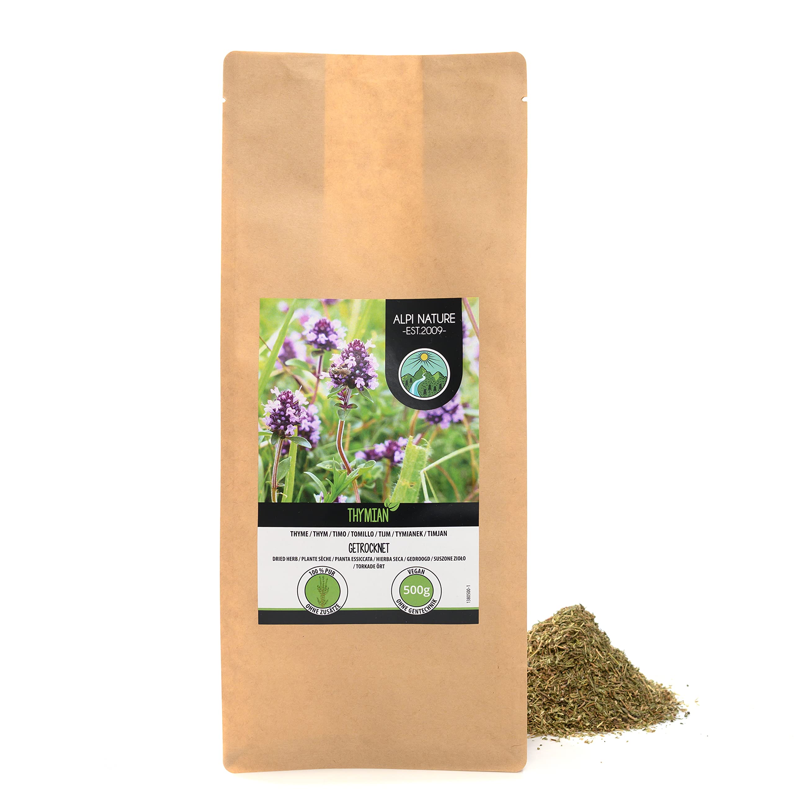 PREPARATION IDEA: Dried thyme is perfect for refining various dishes. To prepare a cup of thyme tea (250 ml), you can pour boiling water over 1 tablespoon (tablespoon) and leave it covered for 8 to 10 minutes, according to your taste. ? ? CARE IN PREPARATION: The thyme is delicately dried. The packaging is carefully handmade to ensure quality. The bag is resealable and ensures the shelf life of the product. 100 NATURAL AND PURE: Our thyme, consisting of the leaves and the upper part of the stem of the plant, is free from any additives, preservatives or flavorings - a 100 natural product. KNOWN AND APPRECIATED FOR CENTURIES: Thyme has been used for centuries in southern and eastern Europe, but also in German-speaking countries, and is an integral part of many dishes and spice blends. Among other things, it is used to refine various meat and fish dishes, salad garnishes and sauces, as well as to prepare thyme tea. THYME: A popular spice, thyme has a high recognition value due to the specific taste it gives to dishes.IDÉE DE PRÉPARATION: Le thym séché est parfait pour affiner divers plats. Pour préparer une tasse de thé au thym (250 ml), vous pouvez verser de l'eau bouillante sur 1 cuillère à soupe (cuillère à soupe) et la laisser couverte pendant 8 à 10 minutes, selon votre goût. ? ? SOIN DANS LA PRÉPARATION: Le thym est délicatement séché. L'emballage est soigneusement réalisé à la main pour garantir la qualité. Le sac est refermable et assure la durée de conservation du produit. 100 NATUREL ET PURE: Notre thym, composé des feuilles et de la partie supérieure de la tige de la plante, est exempt de tout additif, conservateur ou arôme - un produit 100 naturel. CONNU ET APPRÉCIÉ DEPUIS DES SIÈCLES: Le thym est utilisé depuis des siècles dans le sud et l'est de l'Europe, mais aussi dans les pays germanophones, et fait partie intégrante de nombreux plats et mélanges d'épices. Entre autres, il est utilisé pour affiner divers plats de viande et de poisson, garnitures de salade et sauces ainsi que pour préparer du thé au thym. LE THYME: Épice populaire, le thym a une valeur de reconnaissance élevée en raison du goût spécifique qu'il donne aux plats.