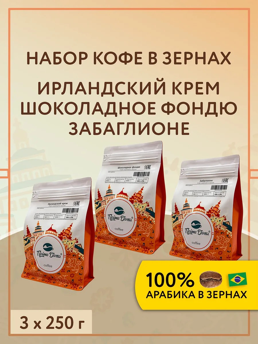 Пейте Дома Набор кофе в зернах 3 по 250 г Ирл.Крем, Ш.Фондю, Забагл