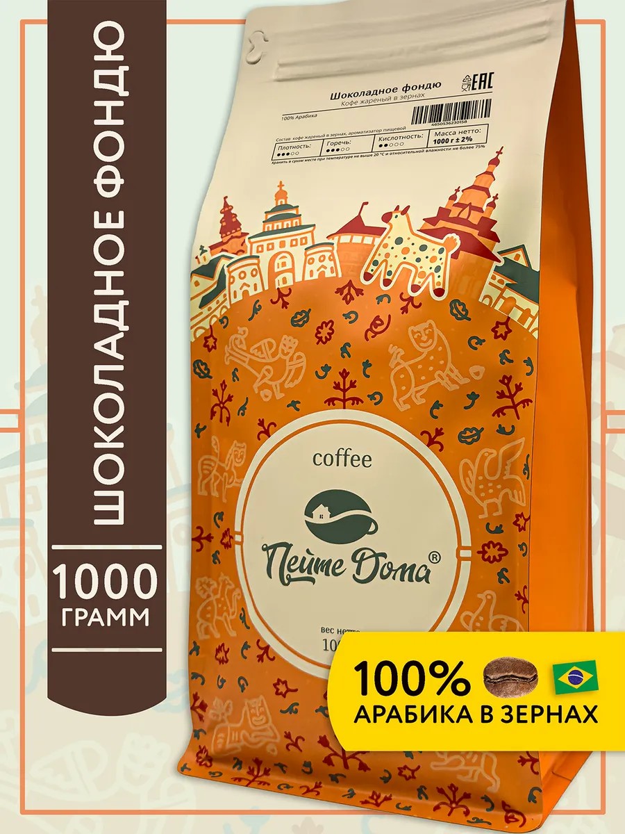 Кофе в зёрнах с ароматом «Шоколадное фондю»/«Баварский шоколад» «Пейте дома» создан для тех, кто любит ароматизированный кофе со сладкими шоколадными нотами. В составе нашего кофе только отборная 100% арабика из Бразилии для сохранения мягкого и богатого вкуса.