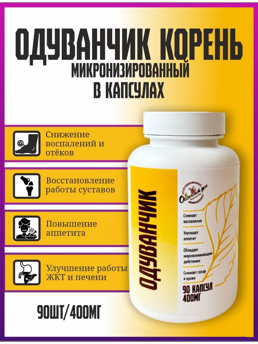 Одуванчик в капсулах на полный курс приема для восстановления хрящевой ткани, лечения артроза, печени, улучшения работы ЖКТ 90 капсул. Одуванчик лекарственный - многолетнее травянистое растение семейства Астровые (Сложноцветные). К этому же семейству относятся ромашки и подсолнухи. Корень одуванчика содержит каротиноиды, минералы, витамины и различные биоактивные компоненты, а также сесквитерпеновые лактоны, хлорогеновую кислоту и цикориевую кислоту. В корне одуванчика накапливается до 40% инулина. Благодаря биологически активным веществам, одуванчик обладает; противовоспалительными, антиоксидантными, антиревматическими, антигипергликемическими, гепатопротекоторными свойствами. Экстракт корня одуванчика обладает мочегонным, желчегонным, потогонным, слабительным, кровоочистительным, успокоительным, бактерицидным и антисклеротическим действием. Применяется для улучшения работы ЖКТ, печени, при дисбактериозе, для повышения аппетита. А также при воспалении и отечности при подагре, при артрозе. Корень одуванчика в капсулах алтай используется для детоксикации организма, стимуляции выработки инсулина и понижения уровня холестерина. Полезен при неврозах и бессоннице. Состав: порошок корня одуванчика, капсула (желатин) без диоксида титана. Условия хранения: хранить в сухом, прохладном, недоступном для детей месте. Рекомендации по применению: по 1 капсуле 3 раза в день (за 30 минут до еды, запить водой). Продолжительность приёма 30 дней. При необходимоси курс можно повторить после перерыва 10-14 дней. Противопоказания: индивидуальная непереносимость, желчнокаменная болезнь, острый гастрит, язвенная болезнь в стадии обострения, острый панкреатит, беременность, период лактации. В ассортименте компании Отварчик пей вы найдете и другие микронизированные травы как в капсулах, так и в виде порошка из трав: корень лопуха, гинкго билоба, корень солодки, корень валерианы, пустырник, чага алтайская, кора осины, кора ивы белой, девясил, корень лопуха и другие.