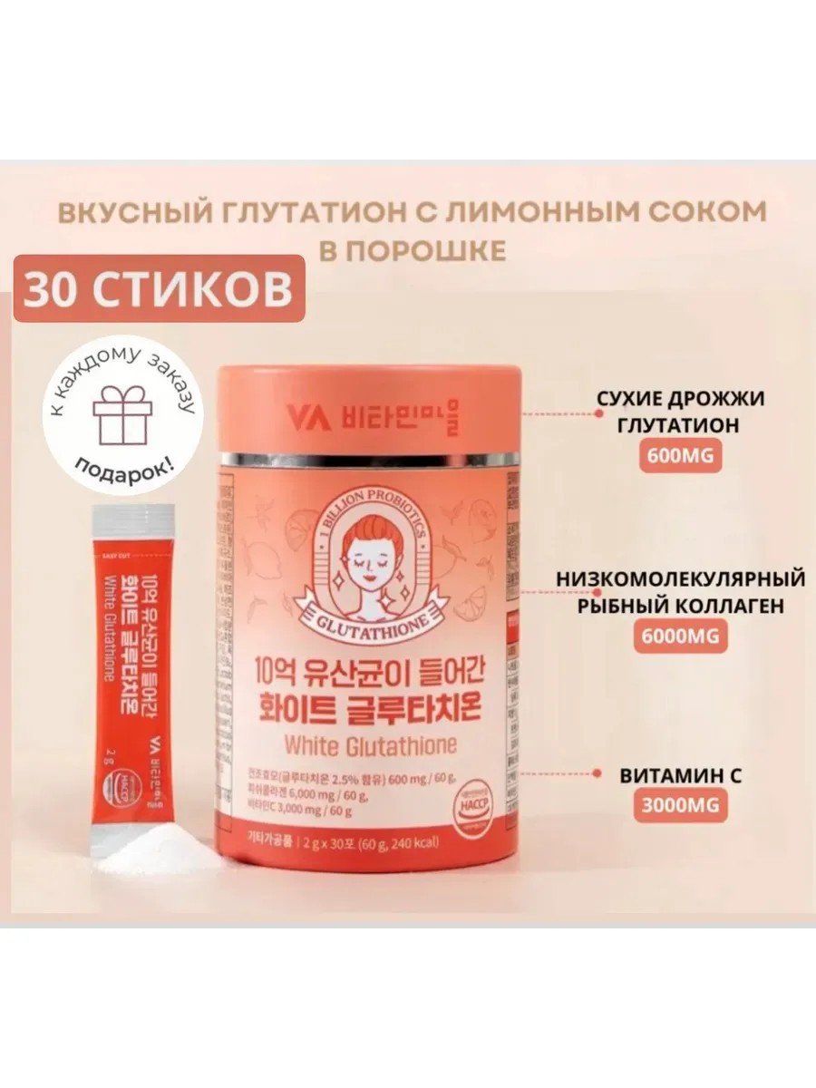 White glutathione sticks are like drinking Cinderella. Glutathione is a complex of three amino acids: glutamate, cysteine, and glycine, linked by peptide bonds. After age 20-25, the body's levels of these amino acids decrease by 1% each year, which causes premature aging. Glutathione is a powerful antioxidant that protects cells from damage and helps the body fight free radicals. Combined with 10 billion probiotics, collagen, elastin and hyaluronic acid, this complex supports healthy skin and strengthens the immune system. Ingredients: Glutathione (dry yeast with 2.5% glutathione content) Fish collagen (low molecular weight) Vitamin C Elastin Hyaluronic acid Milk ceramides Probiotics (17 types, 10 billion cells per serving) Prebiotics (fructooligosaccharides and galactooligosaccharides) White tomato extract In a tube of 30 sticks Method of darkening: pour one stick per day into your mouth and drink with water or dilute in a small amount of water and drink
