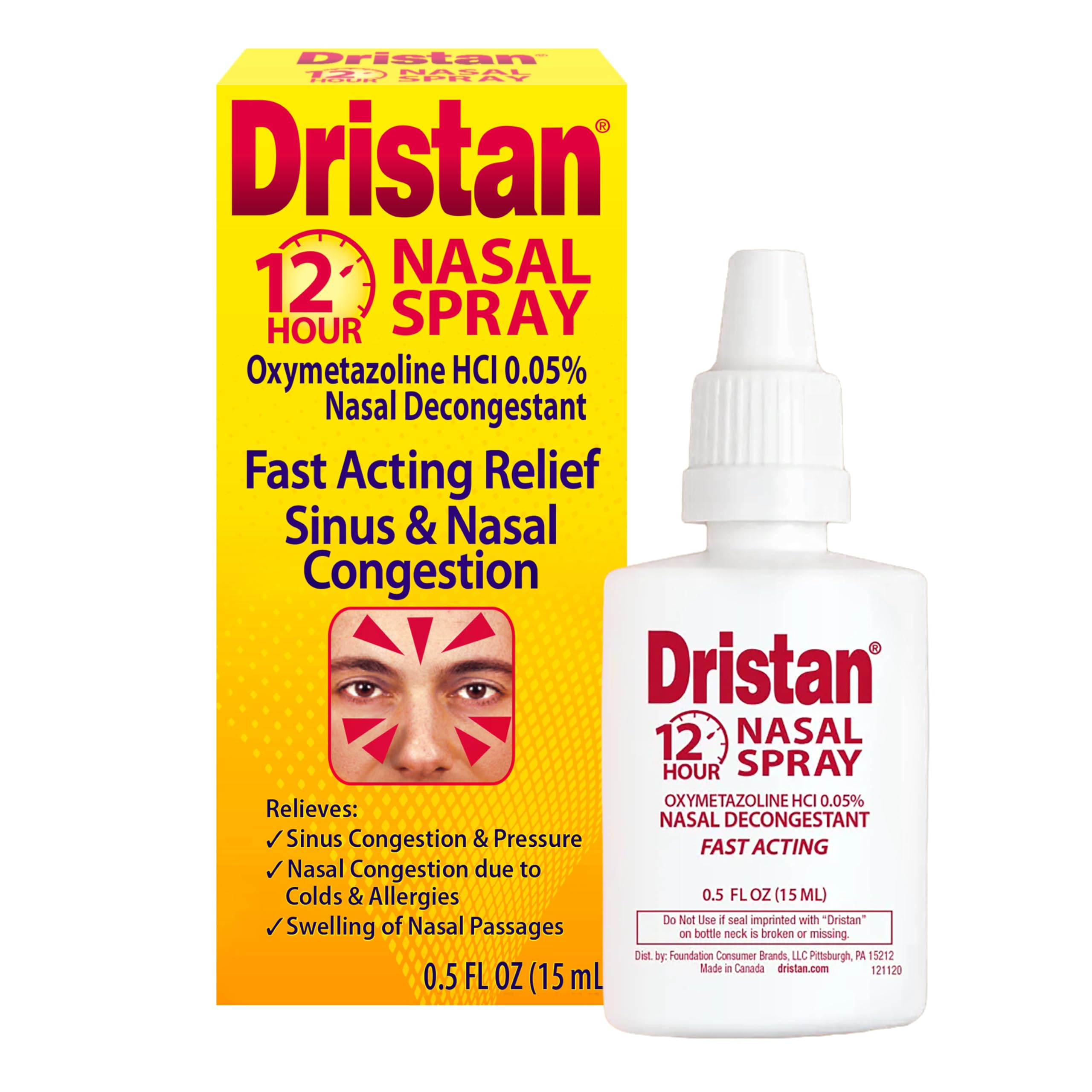 Trusted For Over 50 Years: Dristan has provided instant sinus and nasal congestion relief since 1966 and is safe for adults and children ages 6-12 when used as directed. Relief On-The-Go: Dristan's convenient spray bottle provides easy nasal decongestant relief wherever you go, whenever you need it. Starts To Work In Seconds: Get the sinus and nasal congestion relief you need at the speed you need it. Breathe Freely: The active ingredient oxymetazoline HCI 0.05 shrinks swollen membranes to help relieve sinus congestion and pressure, nasal congestion due to colds, hay fever, and other upper respiratory allergies. 12-Hour Powerful Relief: Dristan 12-Hour Nasal Spray provides fast-acting, long-lasting, powerful nasal congestion relief from allergies and colds for up to 12 hours.