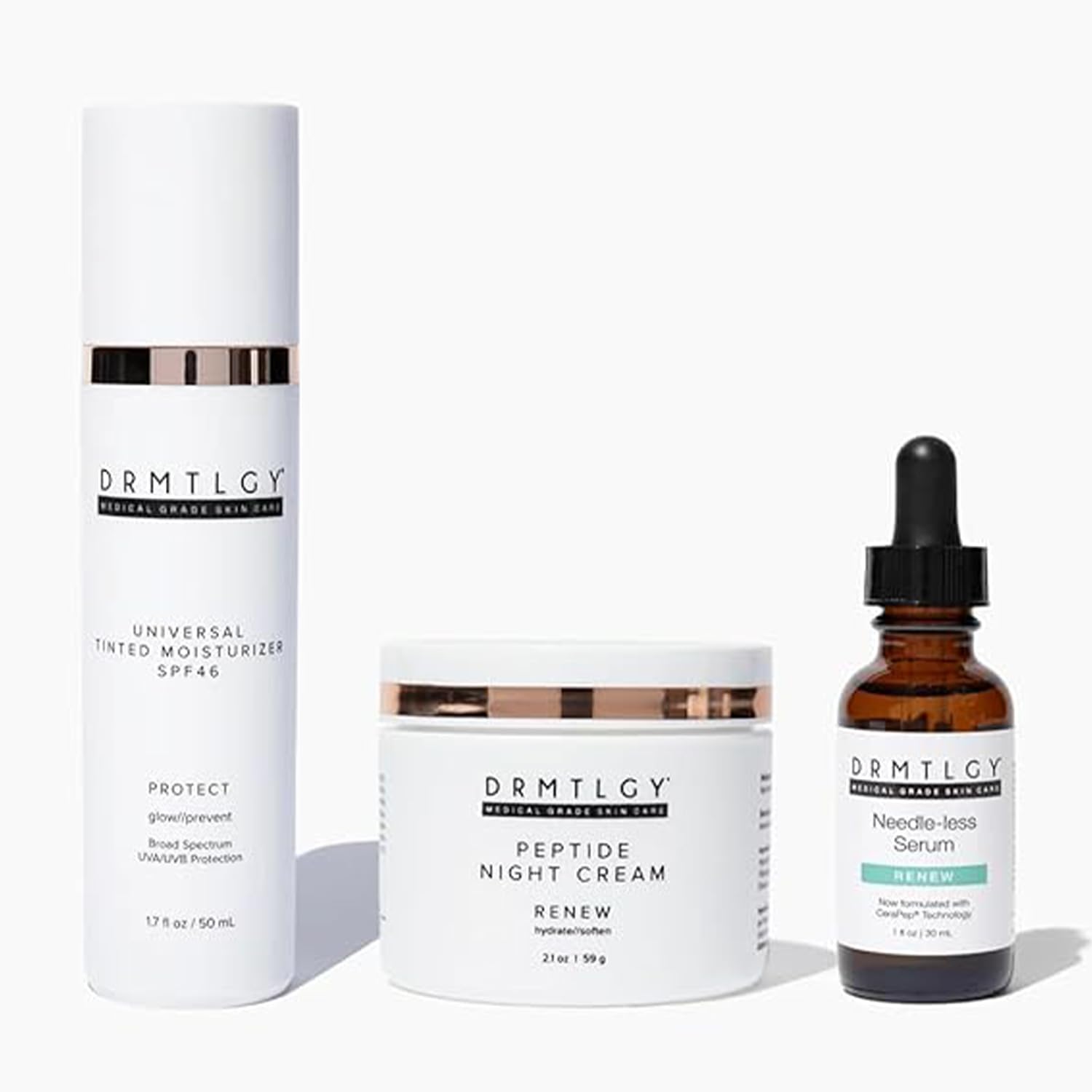 DRMTLGY Anti-Aging Trio: Needle-less Serum Tinted Moisturizer with SPF 46 & Peptide Night Cream