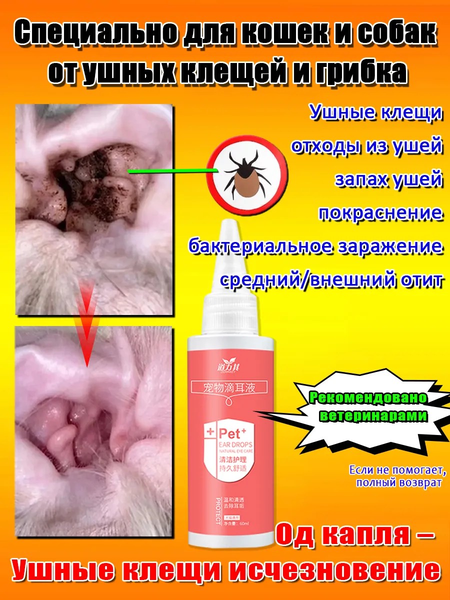 Ушные капли являются незаменимым средством для ухода за ушами собак и кошек, особенно при отодектозе. Они обладают рядом полезных свойств, которые помогут вашим питомцам чувствовать себя комфортно и здорово. Ушные капли мягко очищают ушные раковины и слуховой проход от продуктов жизнедеятельности паразитов. Они эффективно справляются с этой задачей, обеспечивая чистоту и свежесть в ушах ваших питомцев. Отлично справляются от ушного клеща. Как для кошек, так и для собак\n\nКапли препятствуют размножению бактерий на поврежденных участках кожи раковин. Это очень важно, так как бактерии могут вызывать различные проблемы и инфекции в ушах, которые могут негативно сказаться на здоровье животных. Полезным свойством капель является их способность устранять неприятный запах. Они помогают избавиться от неприятных запахов, которые могут возникать в ушах животных из-за различных причин. Основной компонент ушных капель - комплекс терпеноидов эфирного масла сосны и экстрактов 9 целебных растений. Этот комплекс зоотоваров для собак и кошек обладает акарицидными свойствами, что помогает бороться с паразитами, а также оказывает мягкое оздоровительное воздействие на ткани уха. Они не оставляют пятен, не жирные и не липкие, что облегчает их использование и очищение ушей питомцев.\n\nУшные капли предназначены для гигиенического ухода за ушами собак и кошек, страдающих отодектозом. Капли для ушей кошачьи помогут очистить ушную раковину и слуховой проход, а также обеспечат мягкое оздоровительное воздействие на ткани уха, так же подходят для ушей собаки. Состав капель включает фитокомплекс, полученный из различных растительных сырьевых материалов. Простой и эффективный способ обеспечить необходимый уход за ушами ваших питомцев.