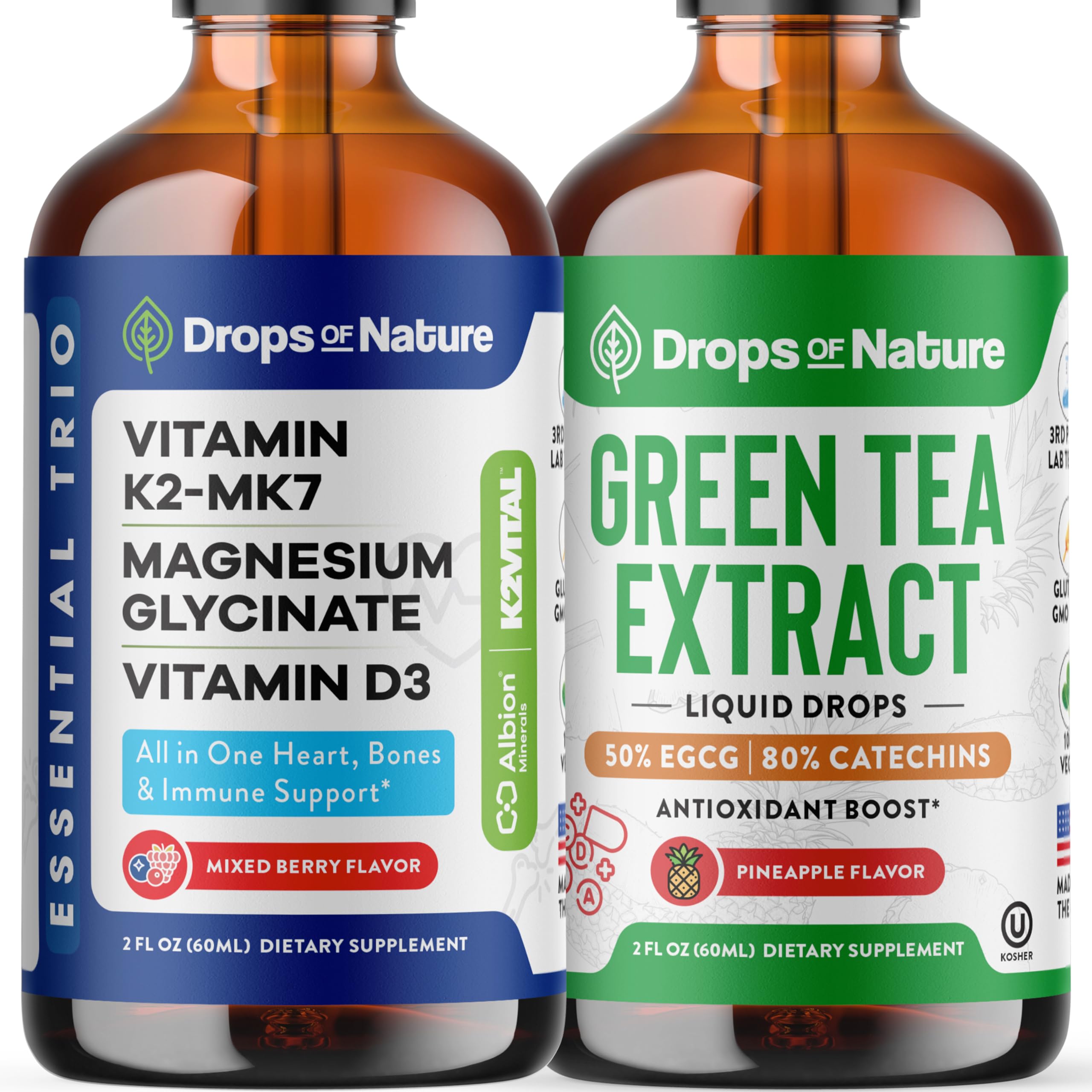 Drops Of Nature Green Tea Extract Liquid Drops (Pineapple 60mL) & Magnesium Glycinate with Vitamin K2 D3 Drops (Mixed Berry 60 mL) Vegan Gluten-Free Antioxidant & Daily Mineral Wellness Support