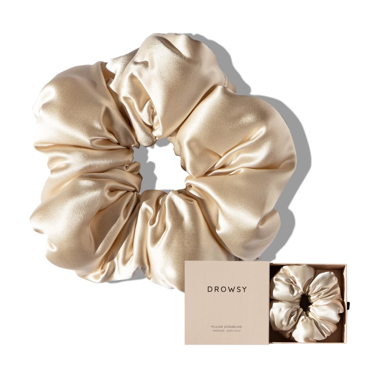 Drowsy Luxury XXL Pillow Silk Scrunchies - Premium Hair Tie - Beauty Accessories to Protect Hair Health Reduce Breakages Maintain Moisture - Oversized - for All Hair Types (Dusty Gold)