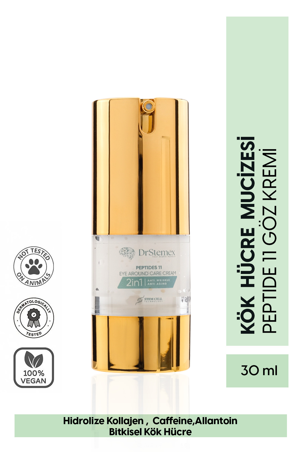• Thanks to the 11 peptide complex, Lecithin, Ectoin and vegetable oils it contains, it helps reduce the appearance of wrinkles around the eyes and prevents the appearance of new ones. It gives a vibrant look to the eye area with the pure caffeine and hyaluronic acid it contains and helps eliminate dark circles and puffiness under the eyes. It intensively moisturizes the eye area, eliminates dryness and prevents moisture loss.