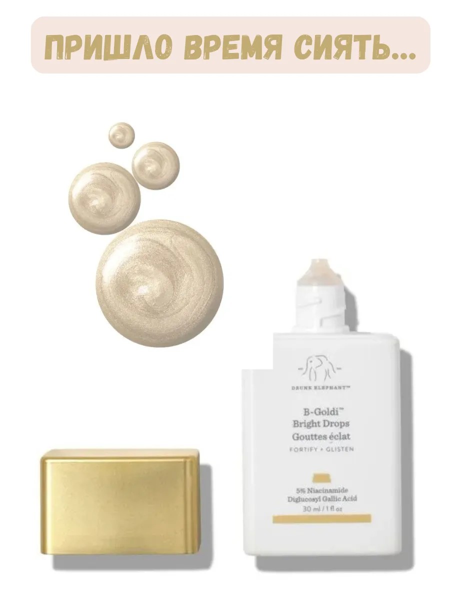 Сочетая в себе уход за кожей и макияжем, сыворотка B-Goldi Bright от Drunk Elephant могут похвастаться уникальной формулой, которая устраняет пигментные пятна и осветляет кожу, одновременно создавая золотистое сияние (без блеска).