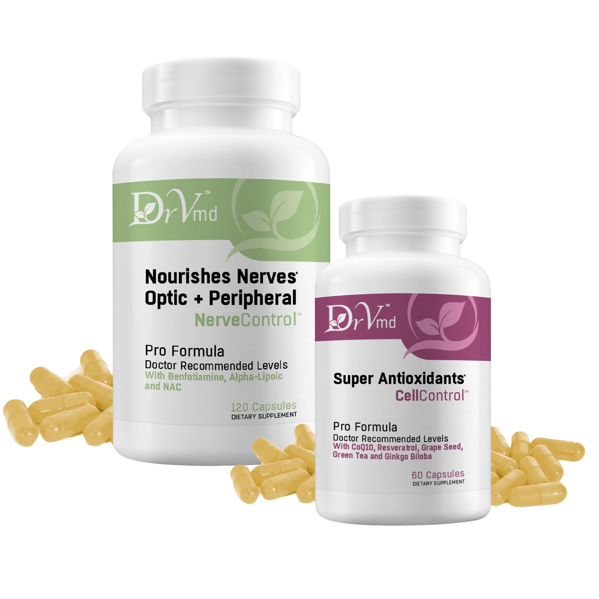 Support nerve health, circulation, and cellular energy with the DrVMD Nerve Antioxidant Support Bundle — a doctor-formulated 2-pack designed to nourish nerve pathways and defend against oxidative stress. This targeted duo combines: Nerve Control – with Alpha Lipoic Acid (ALA), Benfotiamine, NAC, Acetyl L-Carnitine, and B Vitamins to support nerve comfort, eye, hand, and foot function, and healthy circulation. Super Antioxidants – with Resveratrol, CoQ10, Curcumin, Ginkgo Biloba, and Quercetin to enhance blood flow, brain health, and immune defense while fighting free radical damage. Together, they deliver comprehensive daily support for: Nerve Function Circulatory Health Antioxidant Cellular Protection Energy, Focus Overall Vitality Healthy Aging Longevity Developed by physicians using premium, science-backed ingredients, DrVMD formulas are manufactured in GMP-certified facilities for trusted quality and results.Doctor-Developed Quality-Tested: Created by physicians using premium ingredients. Produced in GMP-certified facilities to ensure purity, potency, and consistent performance you can trust. Energy, Focus Longevity: Powerful nutrients support mitochondrial health, helping reduce fatigue, sharpen focus, and promote long-term cellular resilience and endurance. Antioxidant Defense Cellular Health: Super Antioxidants features Resveratrol, Curcumin, Ginkgo Biloba, CoQ10 Quercetin for circulation, brain health, and immune system support. Targeted Nerve Formula: Nerve Control combines ALA, Benfotiamine, NAC, Acetyl L-Carnitine B Vitamins to support nerve function, protect against oxidative stress, and promote cellular energy. Advanced Nerve Circulation Support: Two doctor-formulated supplements for nerve comfort, eye, hand foot health, and healthy circulation — designed to keep your body energized and balanced.