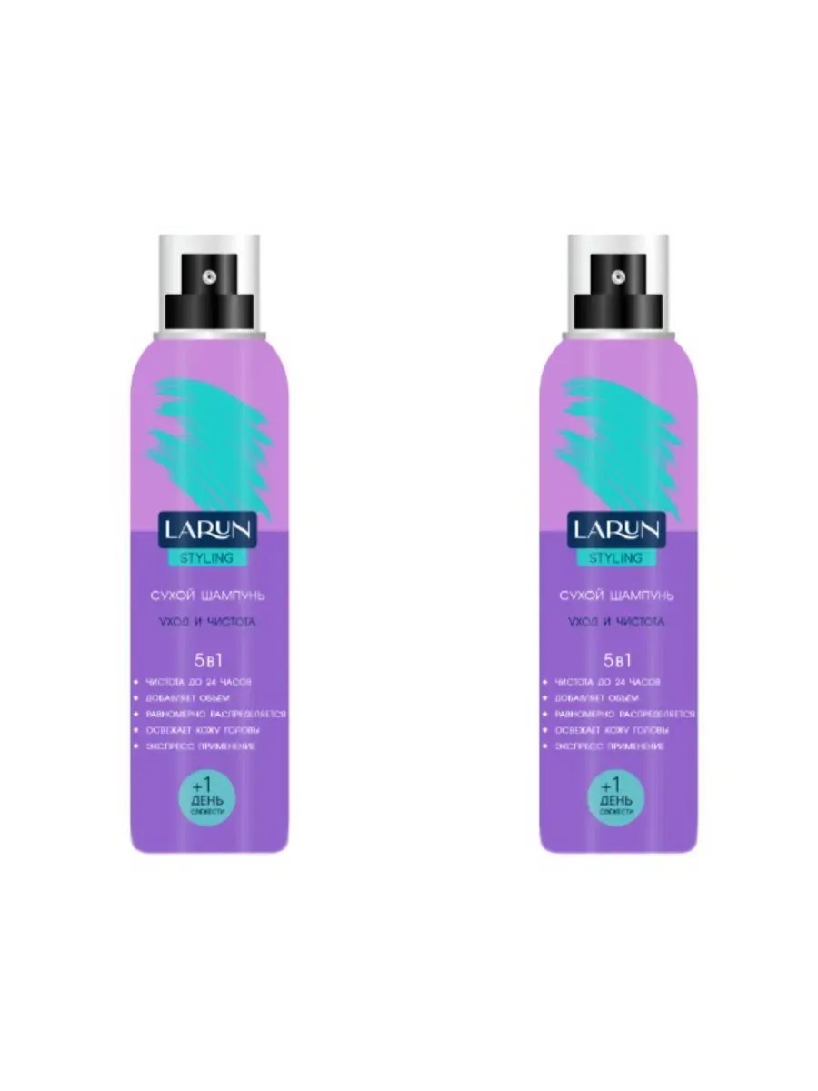 Larun Шампунь сухой Уход и чистота 5в1, 200 мл, 2 штуки в комплекте. Многофункциональный сухой шампунь мгновенно очищает волосы от загрязнений и жирного блеска, освежая кожу головы; равномерно распределяется и добавляет объем.