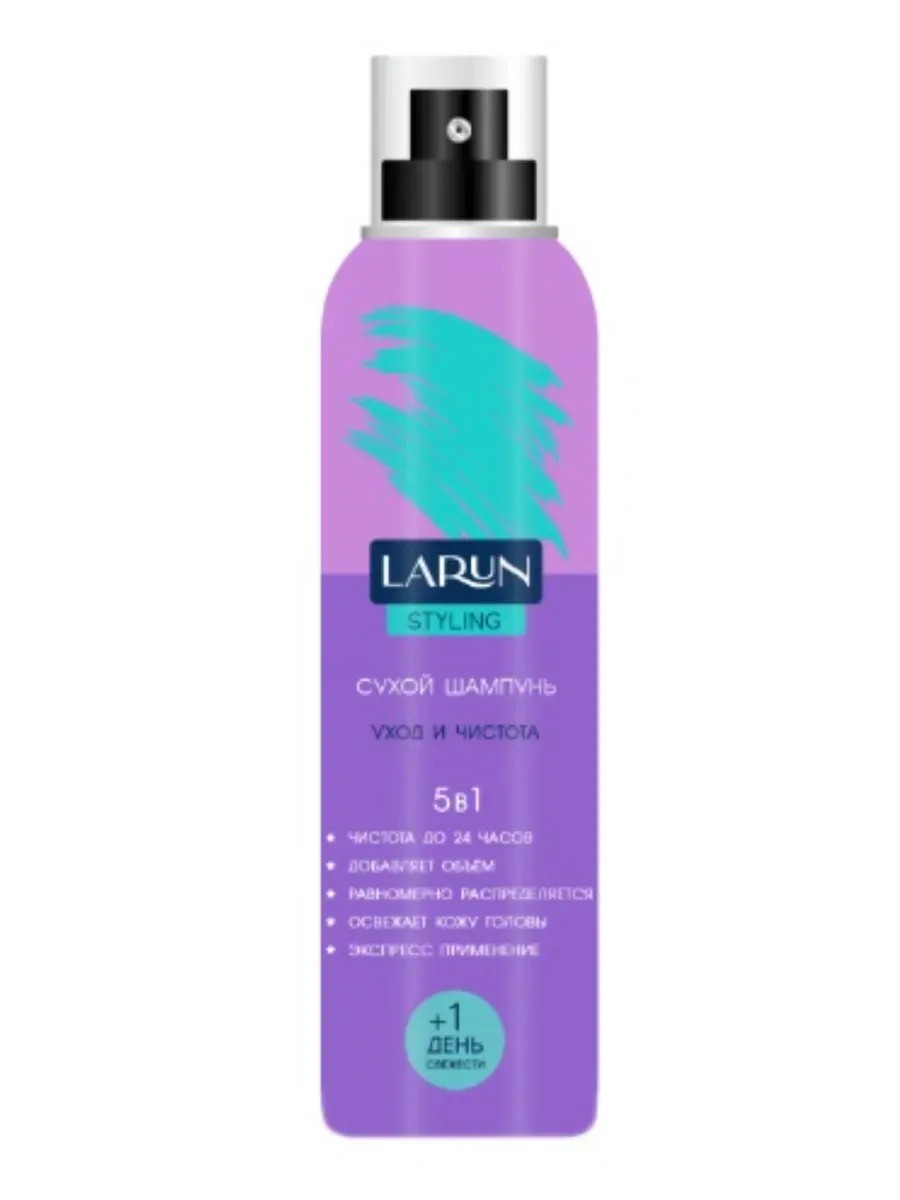 Larun Шампунь сухой Уход и чистота 5в1, 200 мл. Многофункциональный сухой шампунь мгновенно очищает волосы от загрязнений и жирного блеска, освежая кожу головы; равномерно распределяется и добавляет объем.