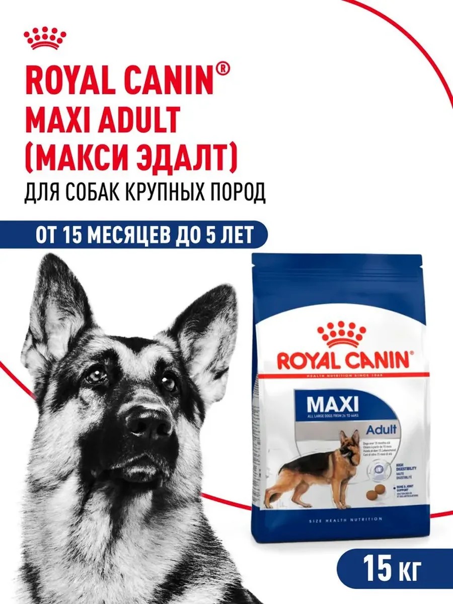 Сухой корм для собак в возрасте с 15 месяцев до 5 лет — ROYAL CANIN Maxi Adult (Макси эдалт) удовлетворяет особые потребности крупных собак (весом от 26 до 44 кг). Обладает высокой усвояемостью, способствует здоровью пищеварительной системы.