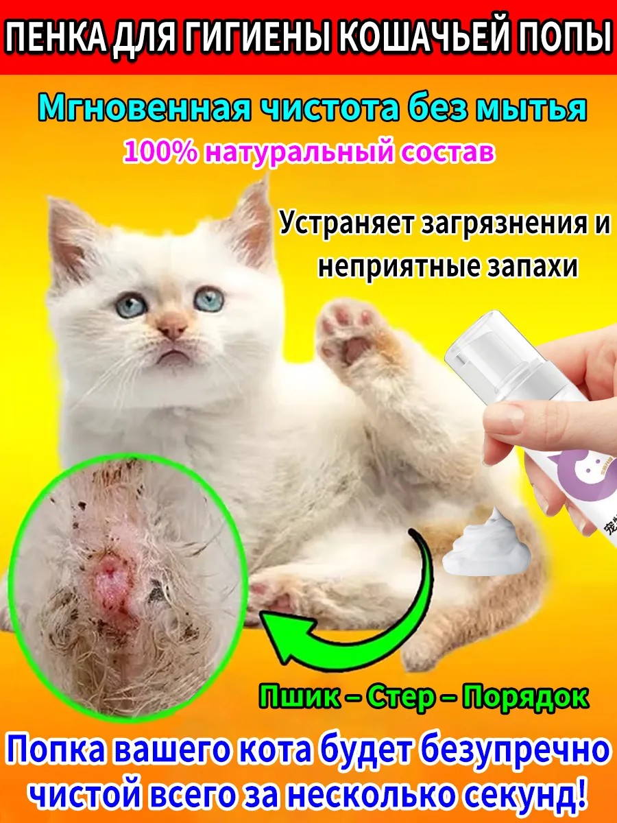 Сухая пена для мытья кошек без воды, 200 мл