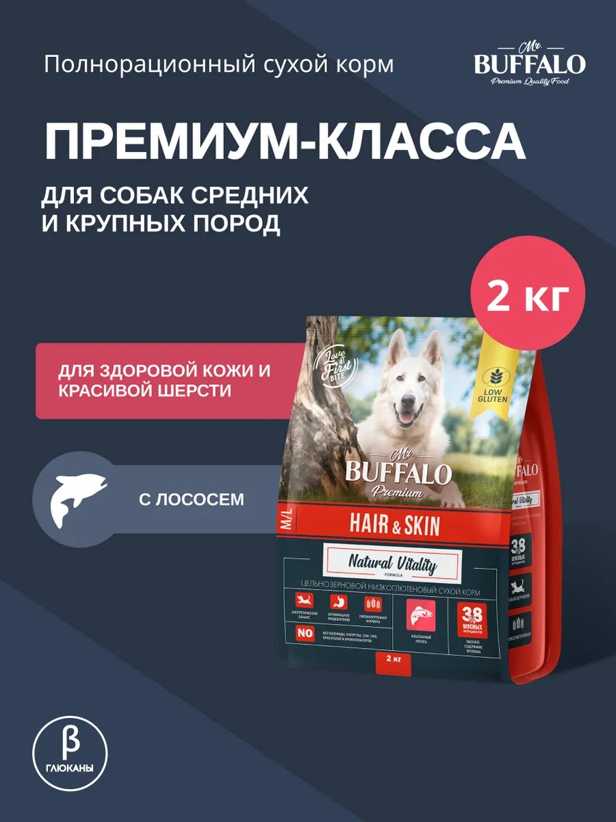 Корм для собак сухой полнорационный премиум класса Mr. Buffalo HAIR & SKIN с лососем для здоровой кожи и красивой шерсти. Рацион, разработанный специально для кормления взрослых собак с повышенной чувствительностью кожи, склонных к частым кожным аллергическим реакциям, а также для собак, которым необходима смена вкусовых качеств их повседневного рациона. Корм для собак сухой Мистер Баффало содержит оптимальное количество белков, жиров и углеводов, что делает корм для собак подходящим для средних и крупных пород. Именно на потребности крупных и средних пород собак рассчитан и витаминно-минеральный премикс. Сбалансированный состав сухого корма для собак обеспечивает прекрасную форму взрослых животных, препятствет набору лишнего веса и предотвращает заболевания суставов. Одним из ключевых компонентов сухого корм Buffalo является уникальная запатентованная добавка Бета-глюкан, которая является натуральным иммуностимулятором. Бета-глюкан активизирует естественные функции организма собак, помогает им бороться с инфекциями, поддерживает здоровое пищеварение, повышает сопротивляемость организма к бактериям, вирусам, грибкам и понижает риск различных заболеваний. Важная аминокислота L-карнитин в составе - для уменьшения лишнего веса и снижения риска сердечных заболеваний. Топинамбур - источник инулина, обладает желчегонным действием, улучшает обмен веществ, укрепляет иммунную защиту, способствует нормализации микрофлоры кишечника. Мясо лосося содержит большое количество Омега-3 и Омега-6 жирных кислот, которые питают и укрепляют волосяную луковицу, улучшают состояние шерсти, придают ей здоровой блеск и шелковистость. Яблоки – источник полезной клетчатки. Помогают пищеварению, выводят из кишечника токсичные вещества. Также в яблоках содержится много кальция, калия, марганца, железа, витаминов и антиоксидантов. Зоотовары для собак с сбалансированным составом - наша главная задача.