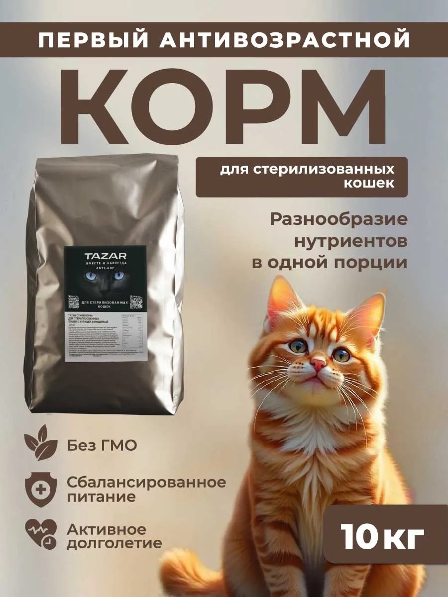 TAZAR is a holistic dry food for sterilized cats from the TAZAR brand, which combines cutting-edge scientific research with your pet's health. It includes a complex of essential vitamins and minerals for your male or female cat. This unique product for your cat is enriched with a patented geroprotective supplement consisting of five powerful compounds that effectively slow the aging process. The use of high-quality ingredients minimizes negative factors such as nutrient excess, a high glycemic index, and an omega-3 imbalance often found in traditional cat foods. TAZAR not only provides complete nutrition but also helps extend the life of your pets, as confirmed by numerous studies in the field of gerontology. The pet food formula was carefully developed with cats' needs in mind, providing them with essential macro- and micronutrients in optimal proportions. This is a ready-to-eat, nutritious, and complete premium diet for your little kitties. Give your pet health and longevity with TAZAR food – the choice for those who value quality and care about their cat's future. It's not just food, it's a philosophy of caring for your furry friend's life.