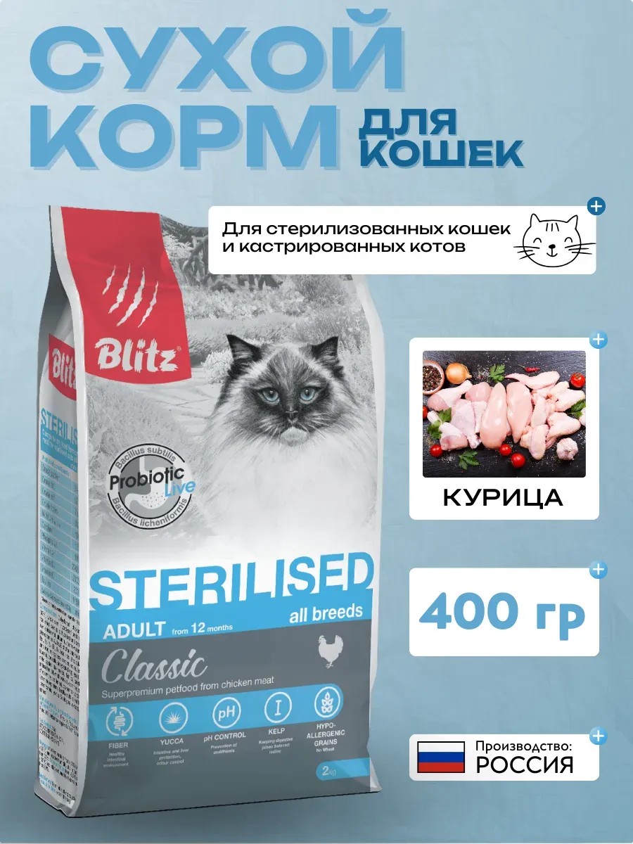 Blitz Classic Chicken Adult Sterilised Cat All BreedsЛиния кормов Blitz Classic для кошекBlitz Sterilised Cats Chicken — это полнорационный сухой корм класса суперпремиум, разработанный с учётом потребностей стерилизованных кошек и кастрированных котов. Рацион тщательно сбалансирован по всем макро- и микроэлементам и подходит для постоянного кормления животных. Единственное, о чём следует позаботиться владельцу, — это свежая вода. Blitz Sterilised содержит оптимальное количество белка и при этом чуть меньше жира, чем другие корма «Блиц» для взрослых кошек. Он идеально подойдёт питомцам после стерилизации, а также малоподвижным кошкам, склонным к набору веса.Особенности корма для кошек Blitz Sterilised с курицейВ основе рациона — бескостная курятина. Этот вид мяса неизменно любим кошками, а дополнительные белковые добавки — печень, яйца, альбумин — делают вкус и аромат корма ещё более насыщенным и притягательным для усатых хищников. Помимо мяса в состав корма Blitz Sterilised Cats Chicken включены растительные компоненты, полезные для пищеварения и перистальтики домашних кошек.Цельнозерновой рис показан при диетическом питании, он не вызывает аллергии и характеризуется крайне низким гликемическим индексом. Входящие в состав корма клюква и DL-Метионин поддерживают оптимальный pH мочи у кошек и снижают риски возникновения МКБ. Куриный и рыбий жир, дополненные семенами льна, содержат весь спектр ненасыщенных жирных кислот Омега группы — шерсть вашей кошки будет блестеть, а энергии хватит на долгие игры и исследования.Чтобы поддерживать здоровую микрофлору кишечника кошек, мы используем только живые и стойкие бактерии рода Bacillus subtilis и Bacillus licheniformis, а также топинамбур и сушёные яблоки, богатые инулином и пектином.Обязательно соблюдайте нормы кормления, разработанные нашими специалистами, ведь от корма Blitz с курицей — просто так не оторваться, даже привередливым кошкам!