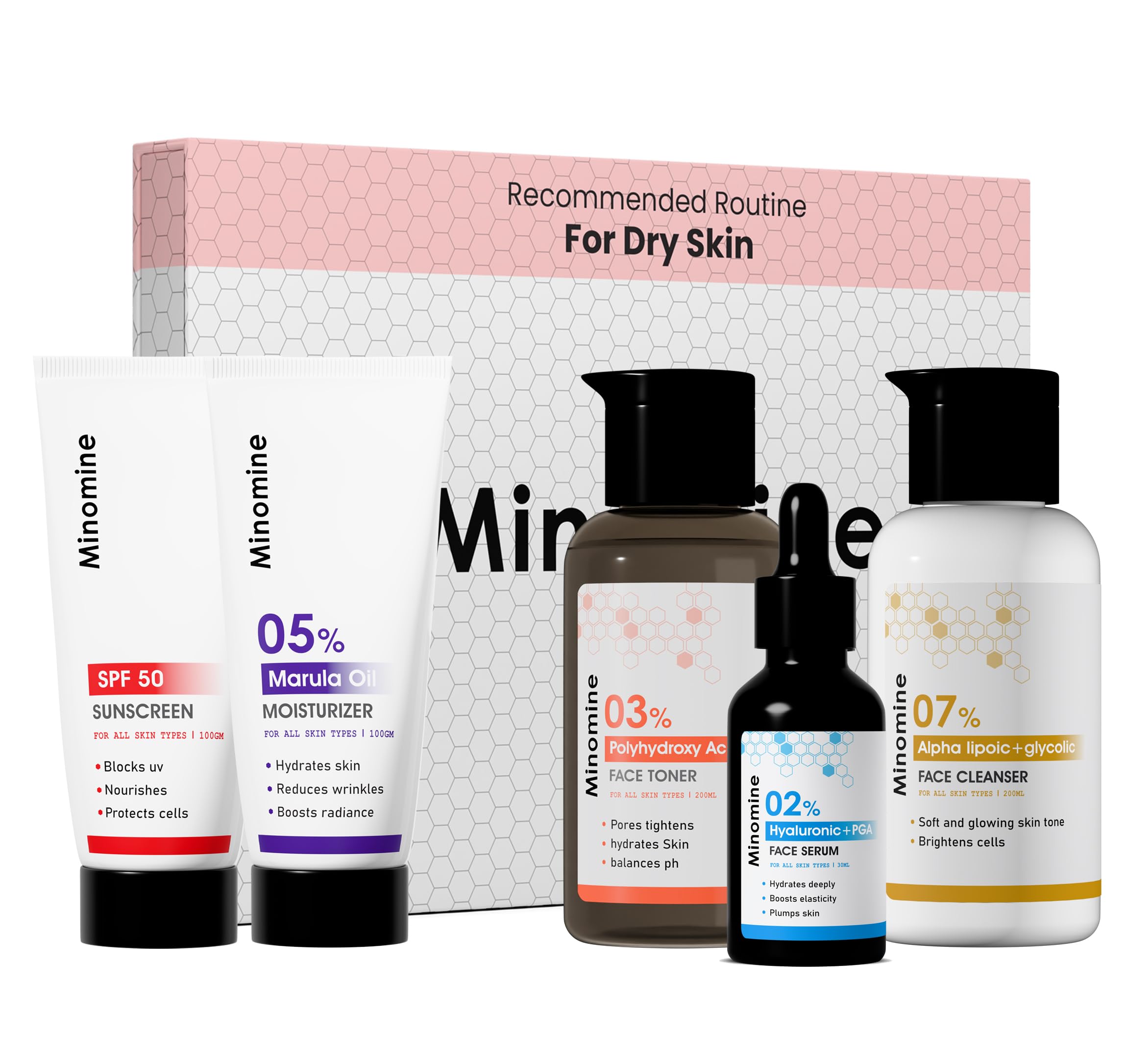 Minomine's Dry Skin Gamechangers Skincare Routine Kit is a unisex 5-step solution crafted to care for dry skin. It includes Alpha Lipoic Cleanser, PHA Face Toner, Hyaluronic Serum, Marula Oil Moisturizer, and SPF 60 Moisturizer. This complete routine gently cleanses, tones, deeply hydrates, nourishes, and protects the skin, leaving it soft, smooth, and refreshed throughout the day.