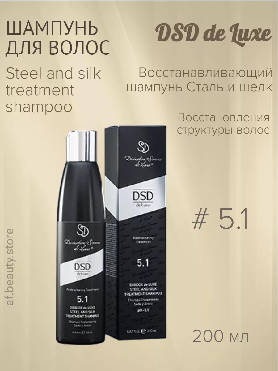 DSD de Luxe Restructuring TreatmentSteel and SilkShampoo 5.1- Шампунь Восстанавливающий Сталь и Шелк Диксидокс де Люкс № 5.1 предназначен для восстановления структуры волос, поврежденных в результате воздействия неблагоприятного комплекса экологических, термических, химических факторов, в том числе окраски волос и избыточной инсоляции. После применения шампуня волосы приобретают здоровый вид, наполняются влагой, появляется блеск, эластичность и дополнительный объем.
