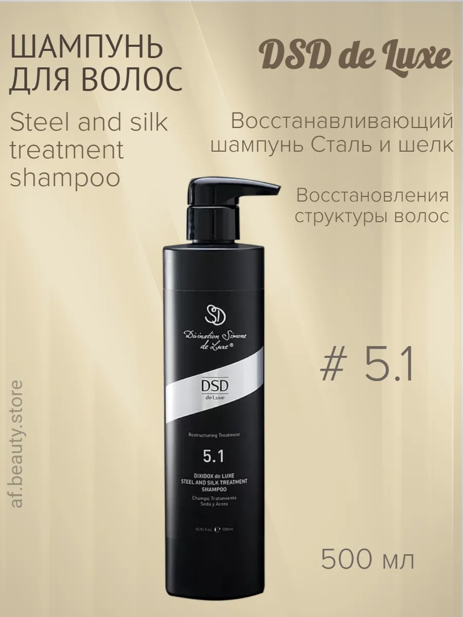 DSD de Luxe Restructuring TreatmentSteel and SilkShampoo 5.1- Шампунь Восстанавливающий Сталь и Шелк Диксидокс де Люкс № 5.1 предназначен для восстановления структуры волос, поврежденных в результате воздействия неблагоприятного комплекса экологических, термических, химических факторов, в том числе окраски волос и избыточной инсоляции. После применения шампуня волосы приобретают здоровый вид, наполняются влагой, появляется блеск, эластичность и дополнительный объем.