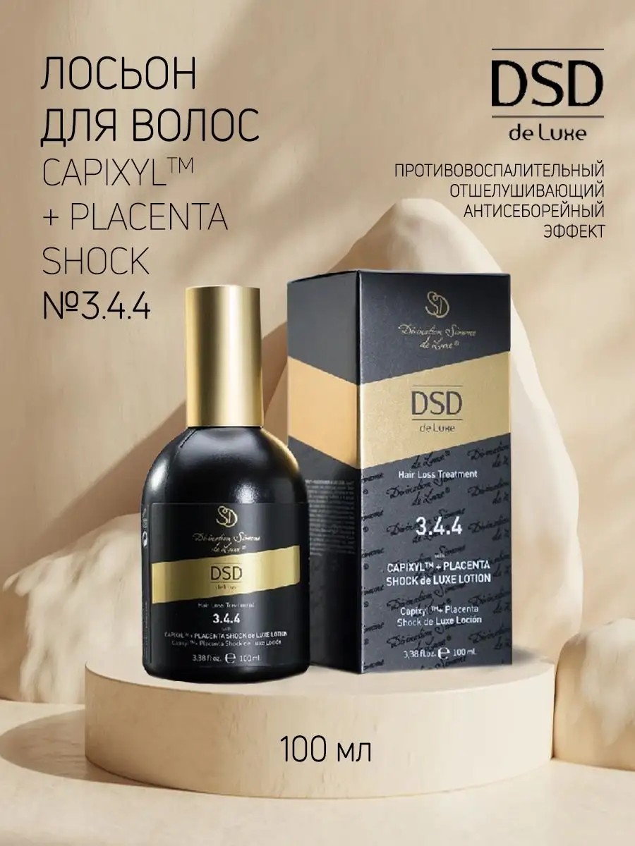 DSD de Luxe Hair Loss Treatment Capixyl Placenta Shock de Luxe Lotion 3.4.4 - Лосьон Капиксил Плацента Шок де Люкс № 3.4.4 является патентованным комплексом, состоящим из тетрапептида и экстракта красного клевера. Основной изофлавон красного клевера Biochanin A является эффективным ингибитором 5-альфаредуктазы 1 и 2 типов. Biochanin A подавляет воспаление путем блокады активности провоспалительных цитокинов. В лосьоне также содержатся салициловая кислота и резорцинол, в сочетании позволяющие получить антисеборейный, отшелушивающий и противовоспалительный эффекты.Применение: Встряхнуть флакон перед применением. Нанести 2 мл лосьона на сухую или влажную кожу волосистой части головы. Препарат также может быть нанесен на стержни волос. Распределить мягкими массажными движениями. Не смывайте лосьон. Применять ежедневно. Минимальный рекомендованный курс применения 3 месяца, если специалистом не рекомендовано иначе.Объем: 100мл.