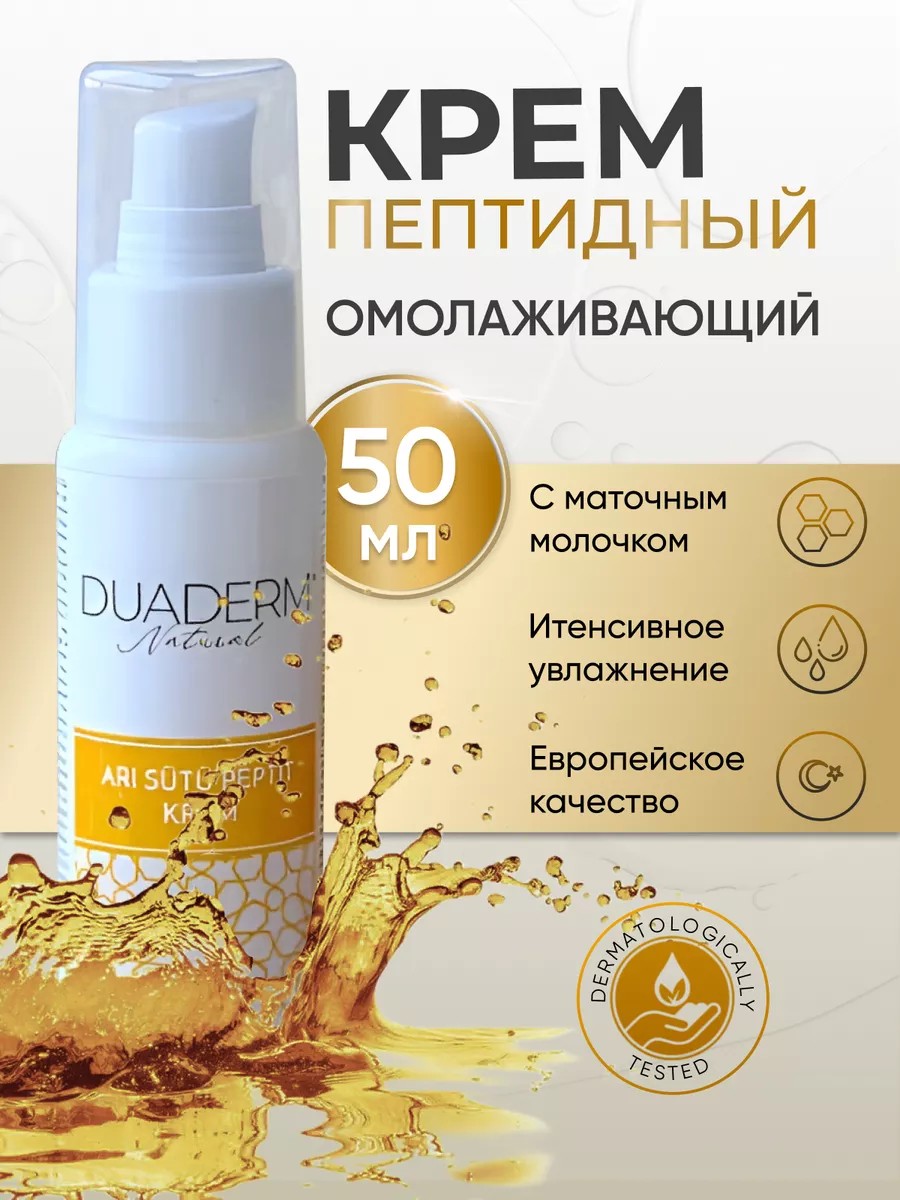 Легкий увлажняющий крем с маточным молочком устраняет сухость, питает и восстанавливает кожу. Благодаря пептиду способствует уменьшению морщин. Помогает защитить кожу от свободных радикалов, благодаря содержащимся в составе витаминам. Содержит матрикины, которые являются месенжерами регенерации и реструктуризации кожи. Матрикины - эффективные антивозрастные пептиды, которые повышают упругость кожи, увеличивают ее эластичность и плотность. Маточное молочко стимулирует выработку коллагена. Увлажняющий и питательный крем для лица подходит для ежедневного использования утром и вечером. Пептидный крем предотвращает потерю эластичности и обеспечивает интенсивное увлажнение. Дневной крем помогает защитить кожу от внешних факторов, УФ-лучей благодаря входящим в состав витаминам В3, В5 и Е. Нормализует работу сальных желез. С первого применения создаёт более гладкий и живой вид. Входящие в состав масла семян кунжута увлажняют кожный покров, смягчают огрубевшие участки. Крем оставляет ощущение шелковистого прикосновения. Регулирует и сглаживает цветовой тон. Обеспечивает водный баланс. Повышает сияние кожи. При использовании Peptide Cream уже в первую неделю кожа станет выглядеть более гладкой и сияющей. Крем для лица с маточным молочком увлажняет кожу и предотвращает шелушение, успокаивает покраснение. В течение 2-х месяцев регулярного использования увидите как кожа омолаживается. Также уменьшает прыщи и угри. Благодаря легкой и нежной текстуре, хорошо впитывается, не оставляет липкости и подходит, как база под макияж, а так же, в качестве, как дневного, так и ночного крема. Наносить крем только на предварительно очищенное лицо по массажным линиям 2 раза в день, утром и вечером. Рекомендуется регулярное применение. Для всех типов кожи. Косметика Duaderm является профессиональным средством для лица. Используются травяные, растительные компоненты. Рекомендована дерматологами.