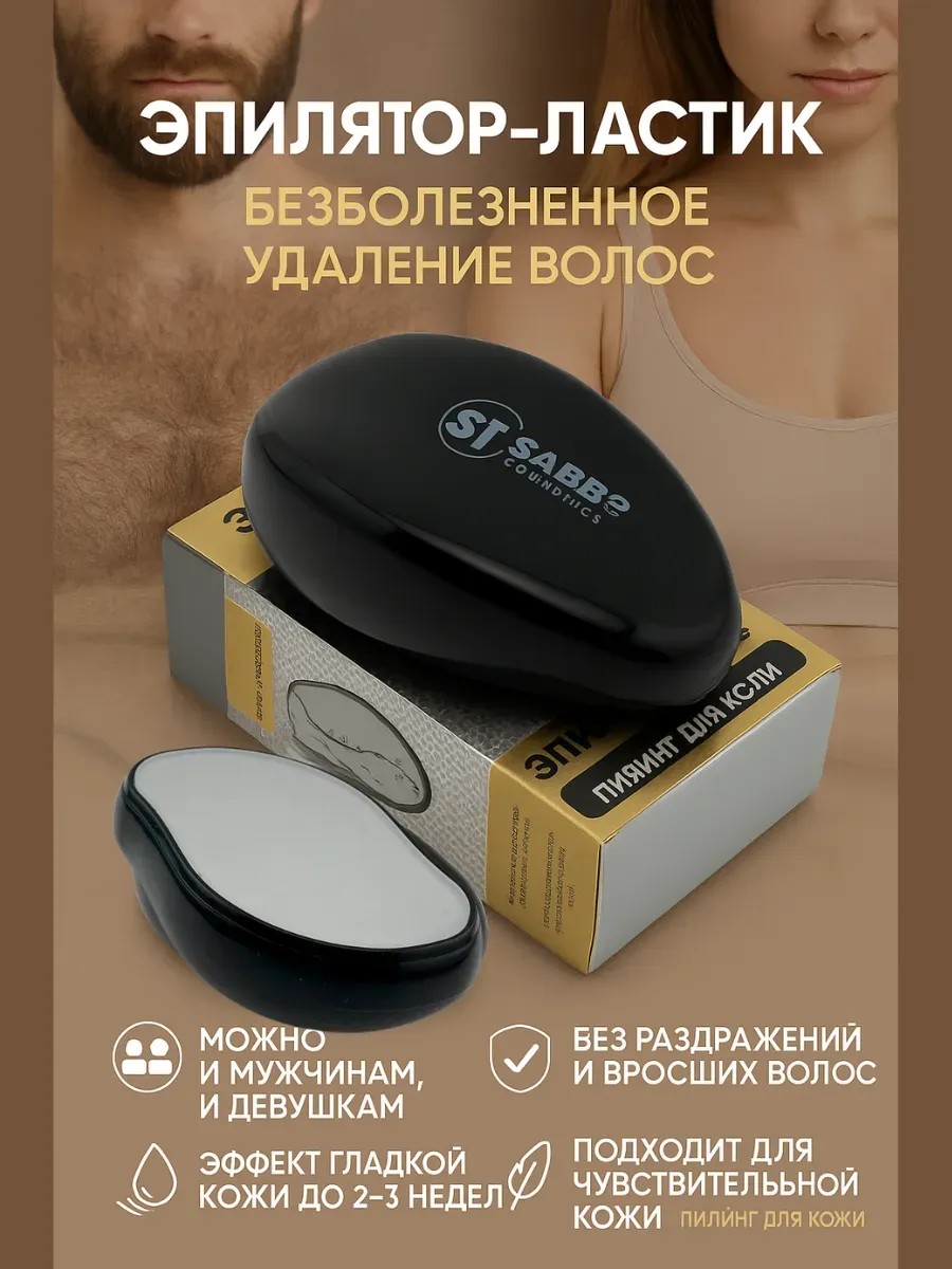 Универсальный эпилятор-ластик от SABB — это инновационное средство для безболезненного удаления волос без использования кремов, воска или бритвы. Подходит для мужчин и женщин, может использоваться на ногах, руках, спине, животе и даже в зоне бикини.