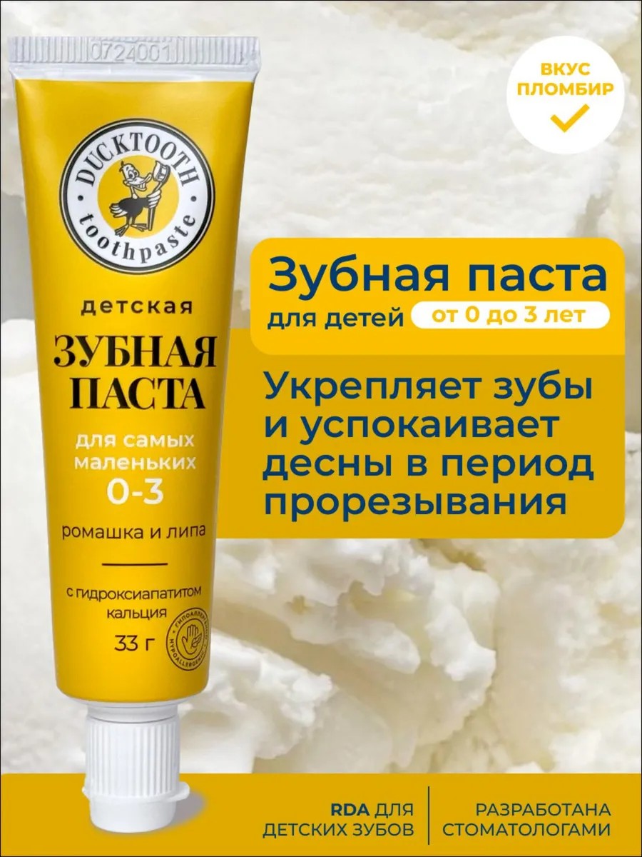 Паста зубная для детей 0-3 лет Ducktooth «Ежедневная защита» со вкусом пломбира — идеальное средство для ухода за растущими зубами вашего ребёнка. Безопасна при случайном проглатывании. Разработанная с учётом особенностей детских зубов, она эффективно очищает и защищает, поддерживая здоровье полости рта.