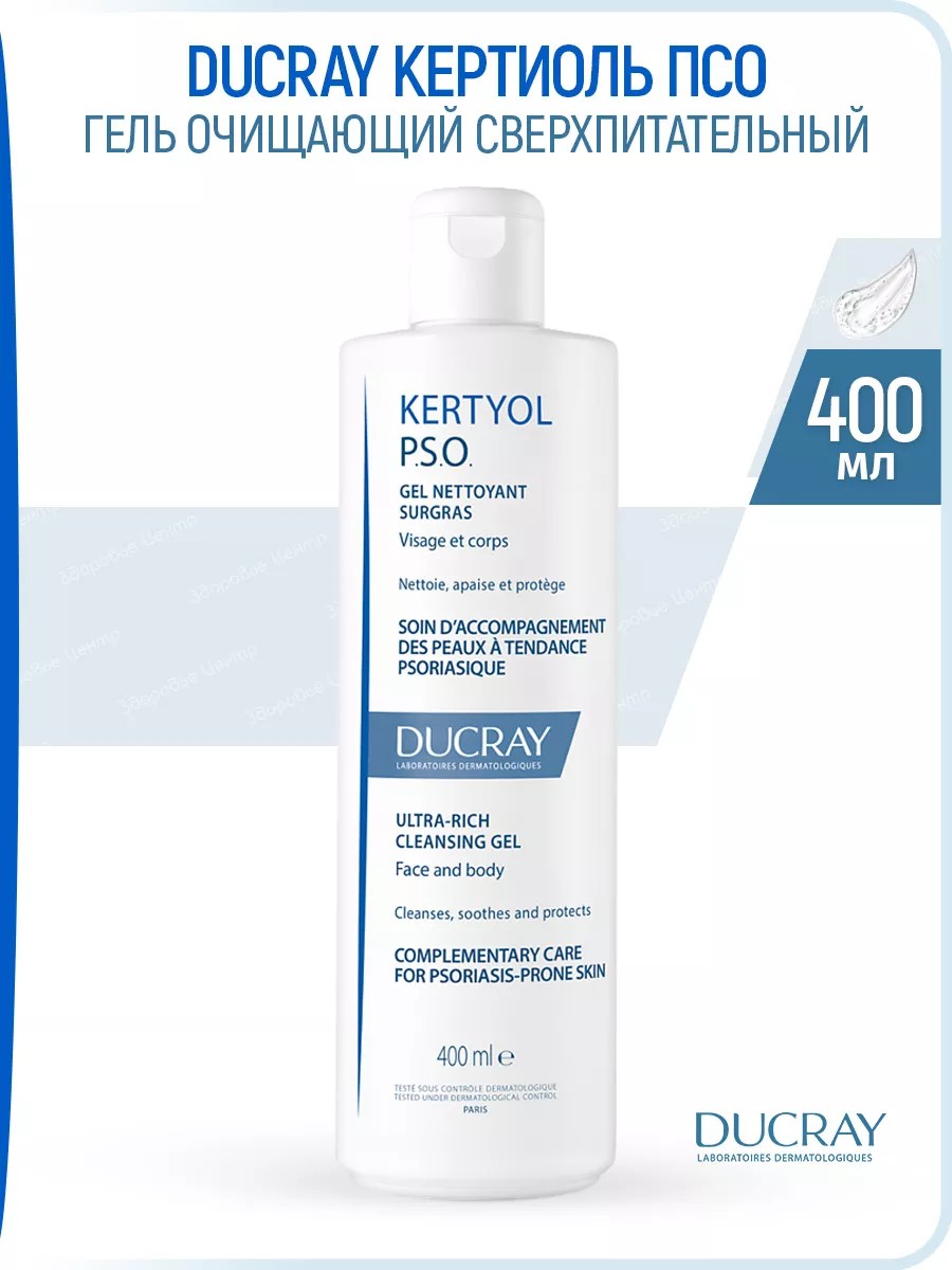 Гель Очищающий Сверхпитательный Дюкрей КЕРТИОЛЬ ПСО (Ducray Kertyol P.S.O. Gel nettoyant), 400 мл. Дюкрэ Кертиоль PSO Сверхпитательный гель разработан для защиты кожного барьера и снятия зуда, для мягкого очищения кожи, склонной к шелушению, с сухими утолщёнными бляшками. Для лица и тела, для взрослых и детей с 12 лет. ПОКАЗАНИЕ: Очищающий уход для кожи, склонной к псориазу. Зуд, дискомфорт, бляшки, вызванные сухостью кожи. ДЕЙСТВИЕ: Нежная очищающая формула Ducray Kertyol PSO Ultra-Rich Cleansing Gel обладает питательными, смягчающими, увлажняющими и успокаивающими свойствами. Продукт мягко смывает загрязнения, восстанавливая гидролипидный барьер эпидермиса. Под действием средства улучшается состояние кожи, исчезает зуд. Очищающий сверхпитательный гель Дюкрэ Кертиоль P.S.O. деликатно отшелушивает ороговевший слой эпидермиса и бляшки, облегчает симптомы псориаза и предупреждает повторные обострения. В результате применения средства кожа восстановит мягкость, гладкость и комфорт. Гель состоит на 82% из ингредиентов природного происхождения. В ходе клинических исследований 100% пациентов отметили мгновенное успокаивающее действие на кожу. АКТИВНЫЕ ИНГРЕДИЕНТЫ: Celastrol, инновационный компонент растительного происхождения, действует непосредственно на кератиноциты, уменьшая появление бляшек и улучшая внешний вид кожи, активные ингредиенты Целастрола, адаптированные для кожи, склонной к псориазу; Vederine способствует отделению бляшек, устраняет шелушение; глицерин восстанавливает гидролипидный барьер кожи, поддерживает оптимальное увлажнение. Физиологический рН, биоразлагаемая формула, без мыла. РЕЗУЛЬТАТ: Чистая, свежая, мягкая и шелковистая кожа. Нет зуда, чувства стянутости и дискомфорта. Его обильная и маслянистая пена нежно ароматизирует кожу. Средство прошло дерматологический контроль. ПРИМЕНЕНИЕ: Гель Ducray Kertyol P.S.O. Нанесите на влажную кожу лица и(или) тела, вспеньте, затем смойте. Для ежедневного использования.