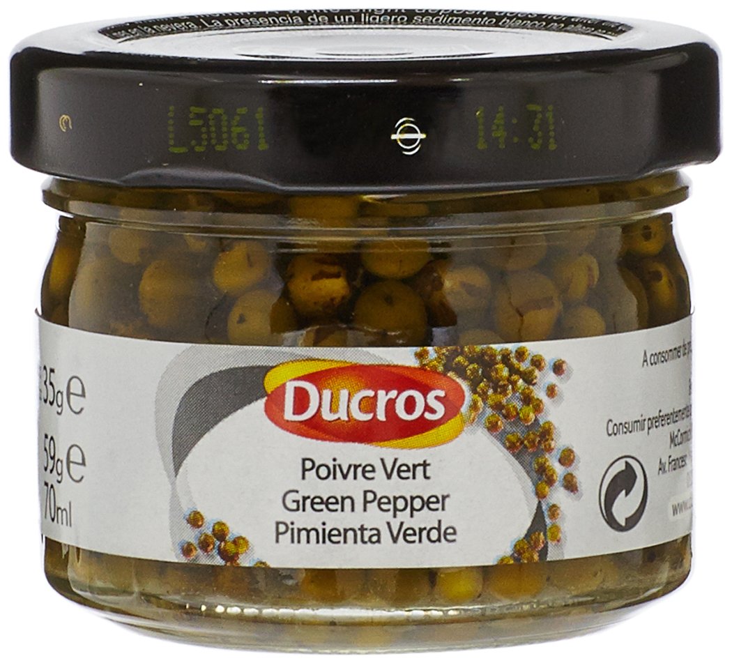 Picked before maturity, green pepper has a fruity aroma. Thanks to its brine preservation, Ducros Green Pepper gives you an incomparable fresh flavor and crunch. Once opened, you can keep it for one month in the refrigerator.Quantity: 35 g. Green pepper. Cueilli avant maturité, le poivre vert possède un arôme fruité. Grâce à la conservation en saumure, le Poivre Vert Ducros vous apporte une saveur fraîche et un croquant incomparables. Après ouverture, vous pouvez le conserver un mois au réfrigérateur.Quantité : 35 g. Poivre vert.