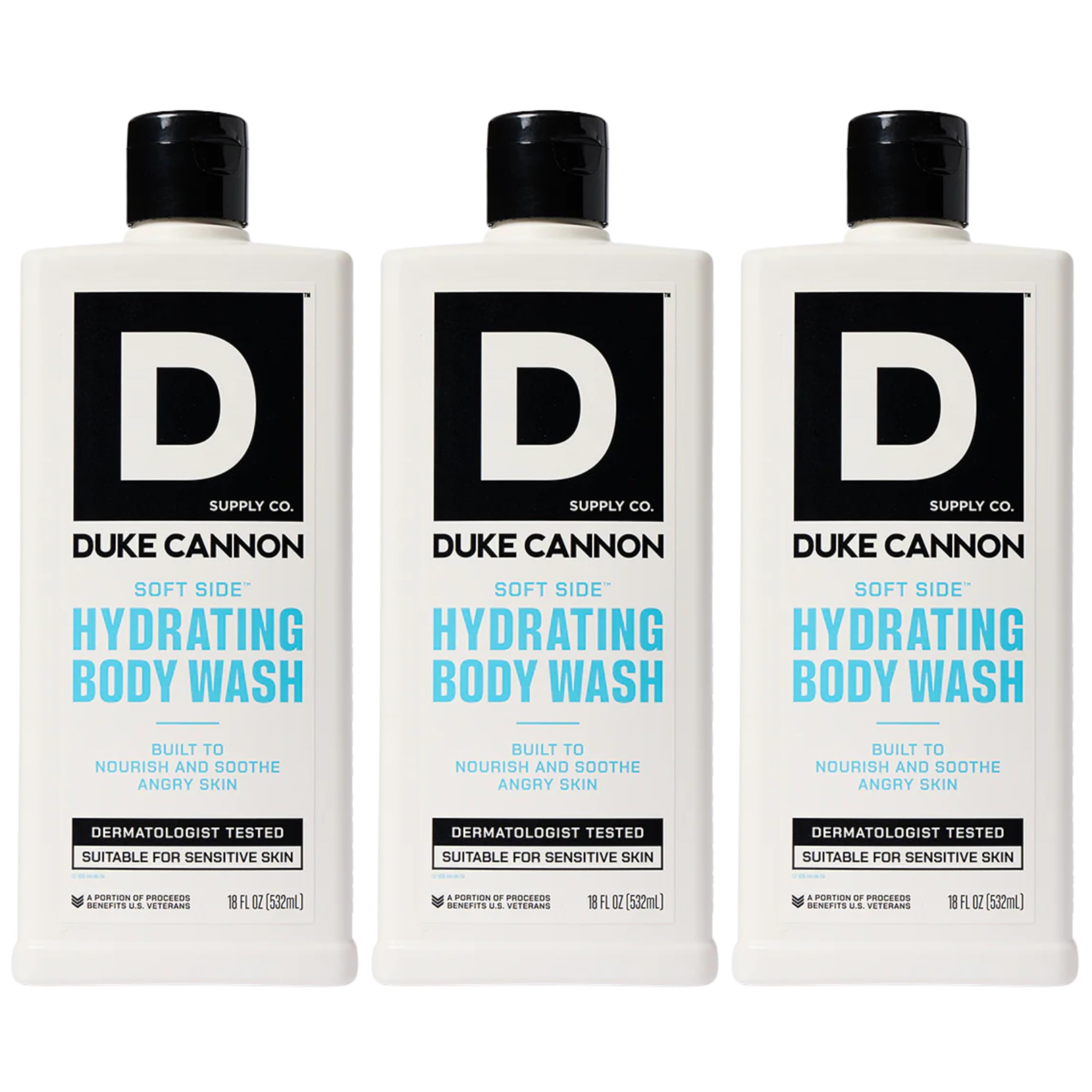 Give your skin the clean and comfort it deserves with Duke Cannon Soft Side Hydrating Body Wash. Built for men who work hard and demand more, this rich formula combines shea butter, oat protein, and coconut oil to nourish dry, irritated skin deeply. Unlike harsh washes, it gently cleanses while helping restore moisture and protect against daily wear and tear. Duke Cannon Infused with a smooth blend of black tea and sandalwood, this body wash delivers a balanced, masculine fragrance that's warm without being overpowering. Each 18 oz bottle is long-lasting and ideal for daily showers. This 3-pack ensures you're stocked up whether you're refilling after work, the gym, or travel. Tough, functional, and made for real-world men — that's the Duke Cannon way.