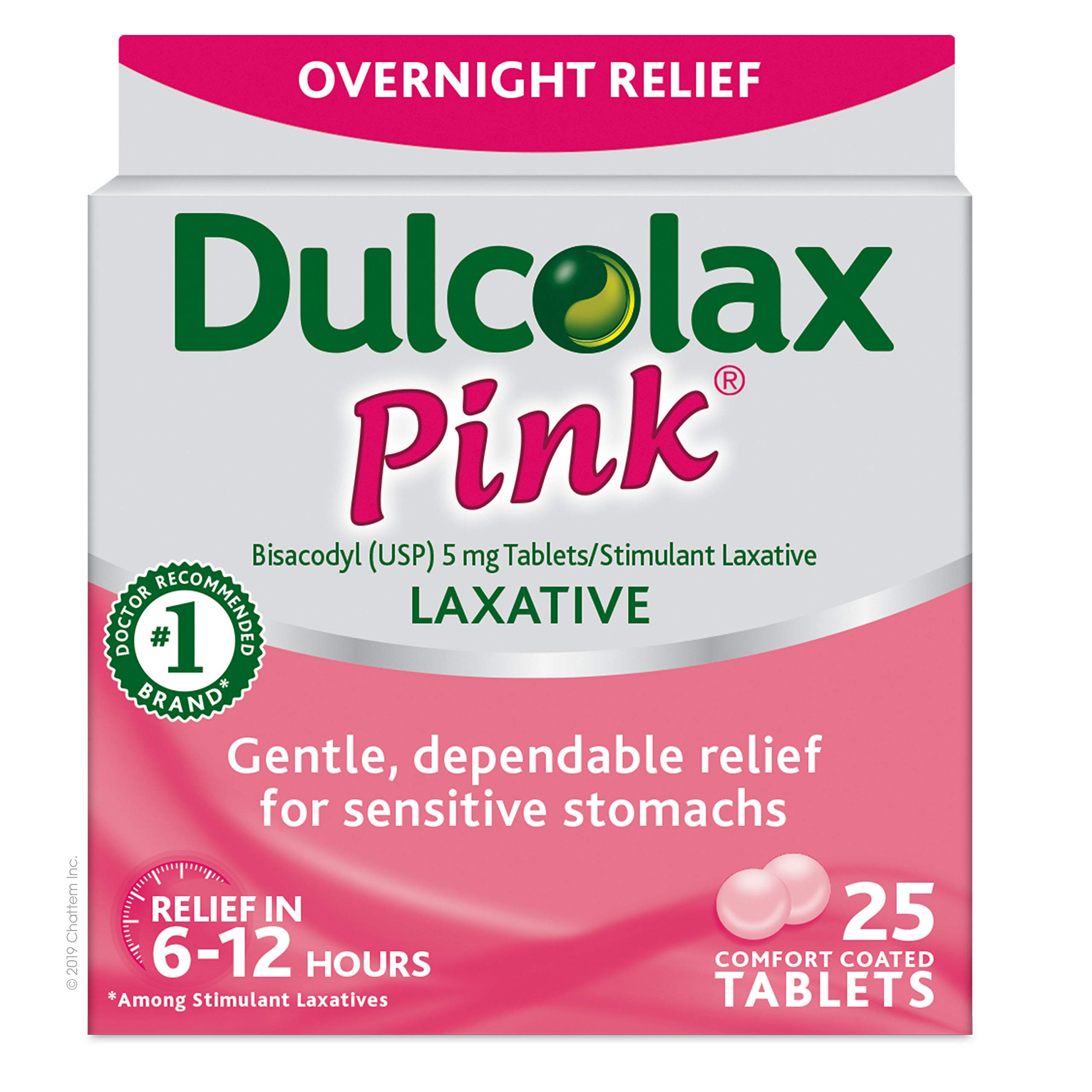 Among OTC Stimulant Laxatives. 1 doctor recommended: Dulcolax is the No. 1 doctor-recommended laxative brand . Active ingredient bisacodyl: Dulcolax Pink Stimulant Laxative is made with bisacodyl, which helps increase movement in the intestines. Relief in 6-12 hours: This stimulant laxative provides dependable relief of hard, dry stools caused by occasional constipation and irregularity. Gentle overnight relief: Dulcolax Pink tablets gently stimulate the intestines to encourage a morning bowel movement. Includes: One (1) 25-count box of Dulcolax Pink Stimulant Laxative comfort coated tablets.