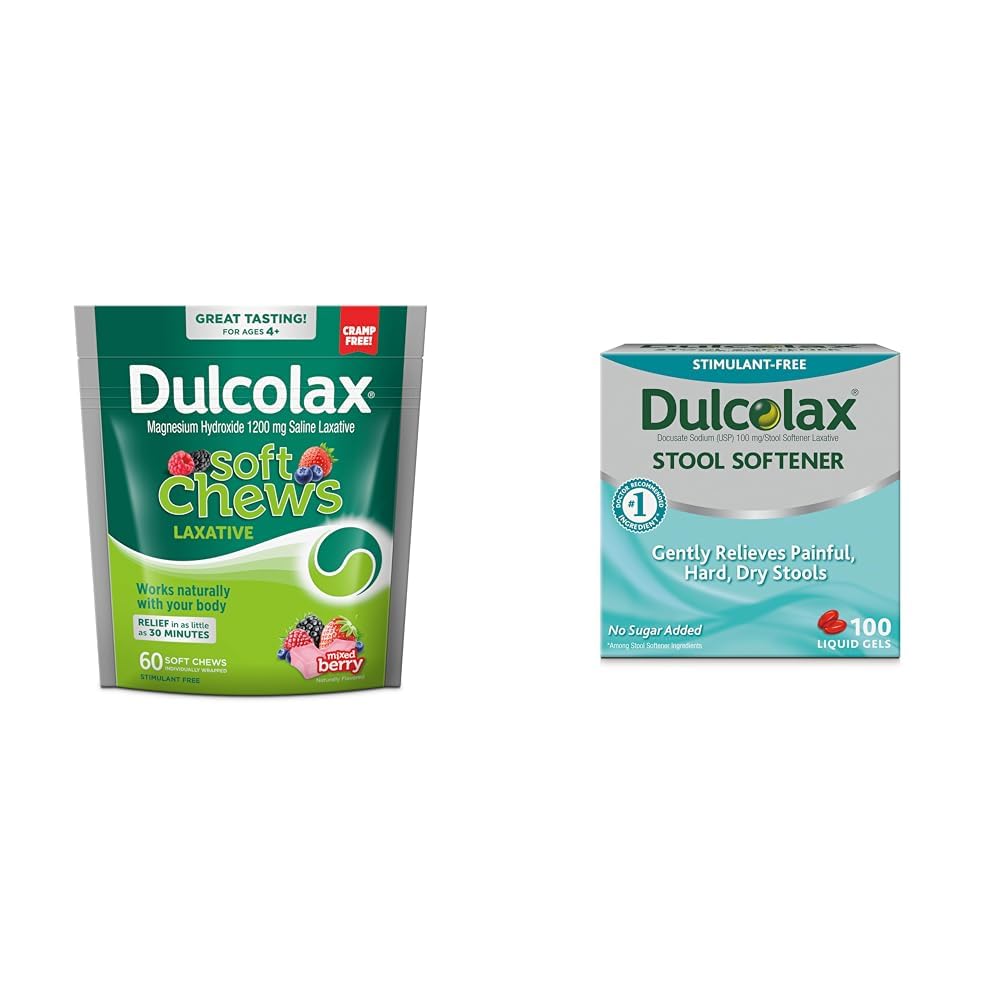 Get fast, gentle relief from occasional constipation with this bundle containing Dulcolax Soft Chews Saline Laxative Mixed Berry and Dulcolax Stool Softener Liquid Gel Capsules. The Dulcolax Soft Chews provide fast relief from constipation in as little as 30 minutes. These great-tasting, stimulant-free chews contain 1200mg of Magnesium Hydroxide and work naturally with the body's water content to produce a bowel movement. Individually wrapped, these convenient 60-count chews can be taken on-the-go. Complementing the fast-acting chews, Dulcolax Stool Softener Capsules gently relieve painful, hard stools. The 100-count liquid gel capsules contain 100mg Docusate Sodium which hydrates and softens stool for easier passage in 12-72 hours. As the 1 doctor recommended stool softener ingredient, Docusate Sodium provides non-stimulant relief. With both fast-acting and gentle stool softeners, this bundle allows you to comfortably find relief from occasional constipation. The convenient individually wrapped chews and liquid gel capsules complement each other to produce effective relief day or night.