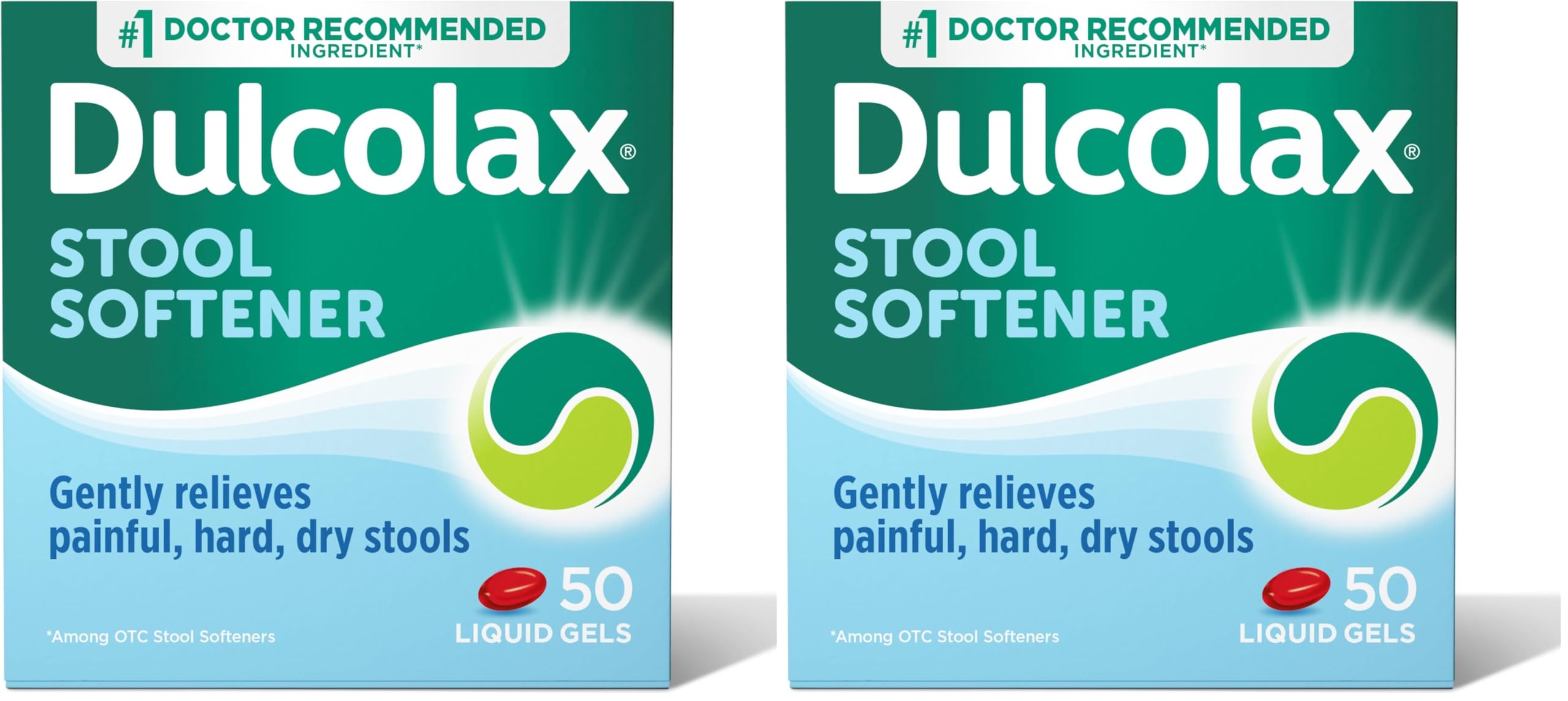 Stimulant free: Dulcolax stool softeners are made with a stimulant-free formula for gentle and effective relief. Trusted relief: Made with the No. 1 doctor-recommended ingredient . On-the-go convenience: Pack these stool softener laxative gel capsules in your travel essentials to help you get back to being regular when stress and overindulgence slow you down. Works in harmony with your body: Made with docusate sodium, Dulcolax stool softeners work naturally with the water in your body to hydrate stool, making it softer and easier to pass. Predictable relief: These stool softener laxatives relieve occasional constipation and irregularity in as little as 12 to 72 hours. Gentle constipation relief: Dulcolax stool softeners provide gentle relief for painful, hard, dry stools. Includes: One (1) 50-count box of Dulcolax Stool Softener Laxative Liquid Gel Capsules with docusate sodium 100 mg. The information below is per-pack only.