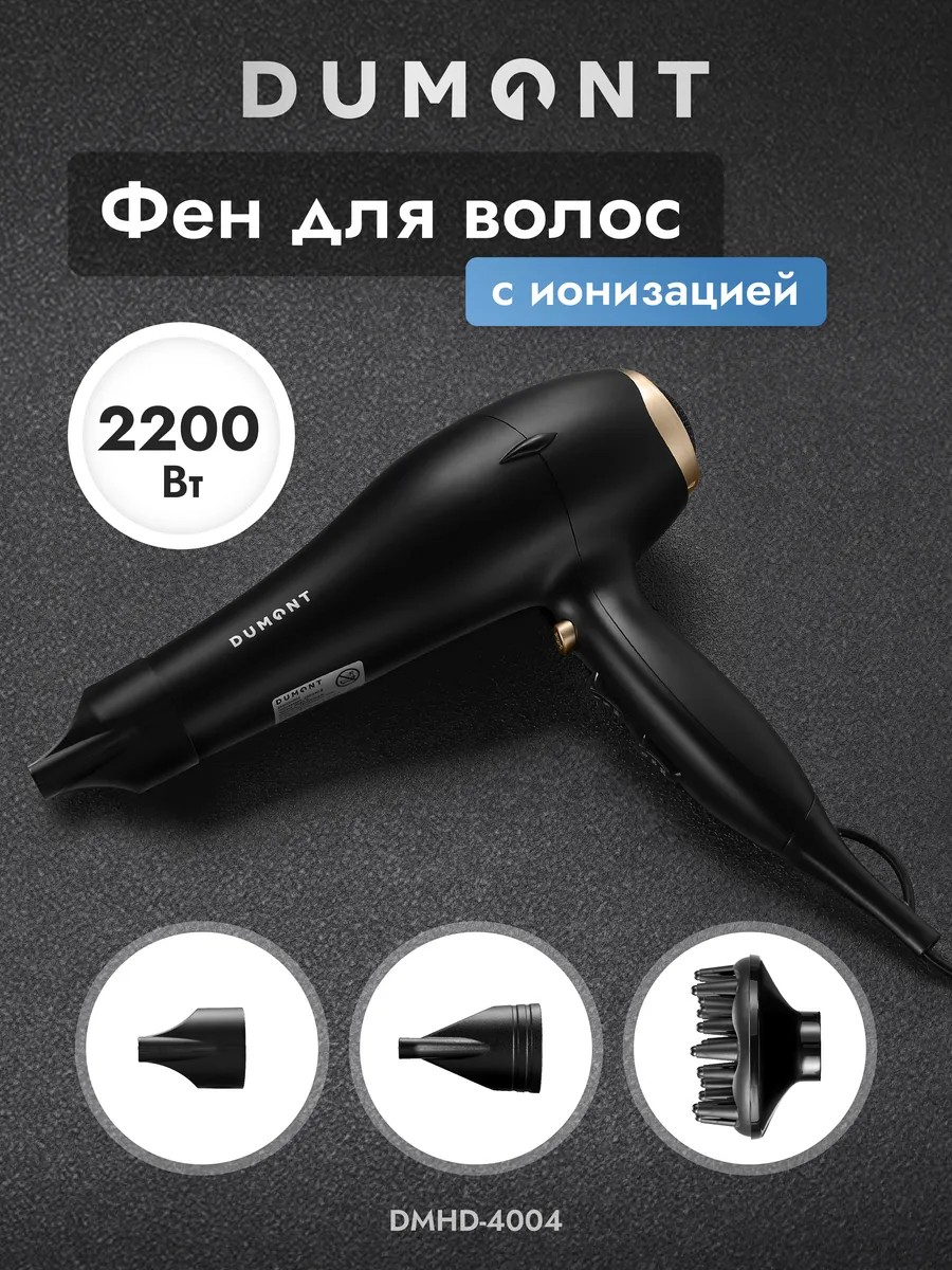 | Комплектация | Фен для волос Dumont DMHD-4004 -1шт.; Руководство по эксплуатации; Насадка концентратор -1шт.; Насадка диффузор -1шт. |