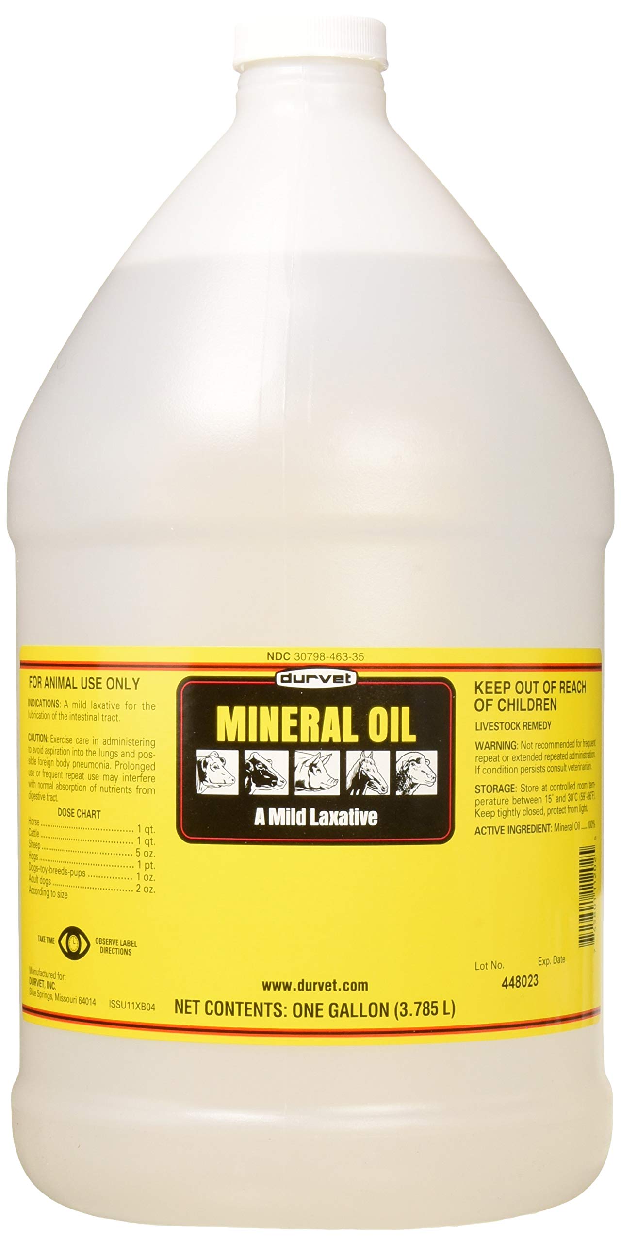 Made of pure, 100 percent natural mineral oil with no additives or preservatives. Ready for use with horses, foals, cattle, calves, sheep, hogs and dogs. A mild laxative for the lubrication of animals' intestinal tracts. 1 gallon of Durvet Mineral Oil livestock laxative.