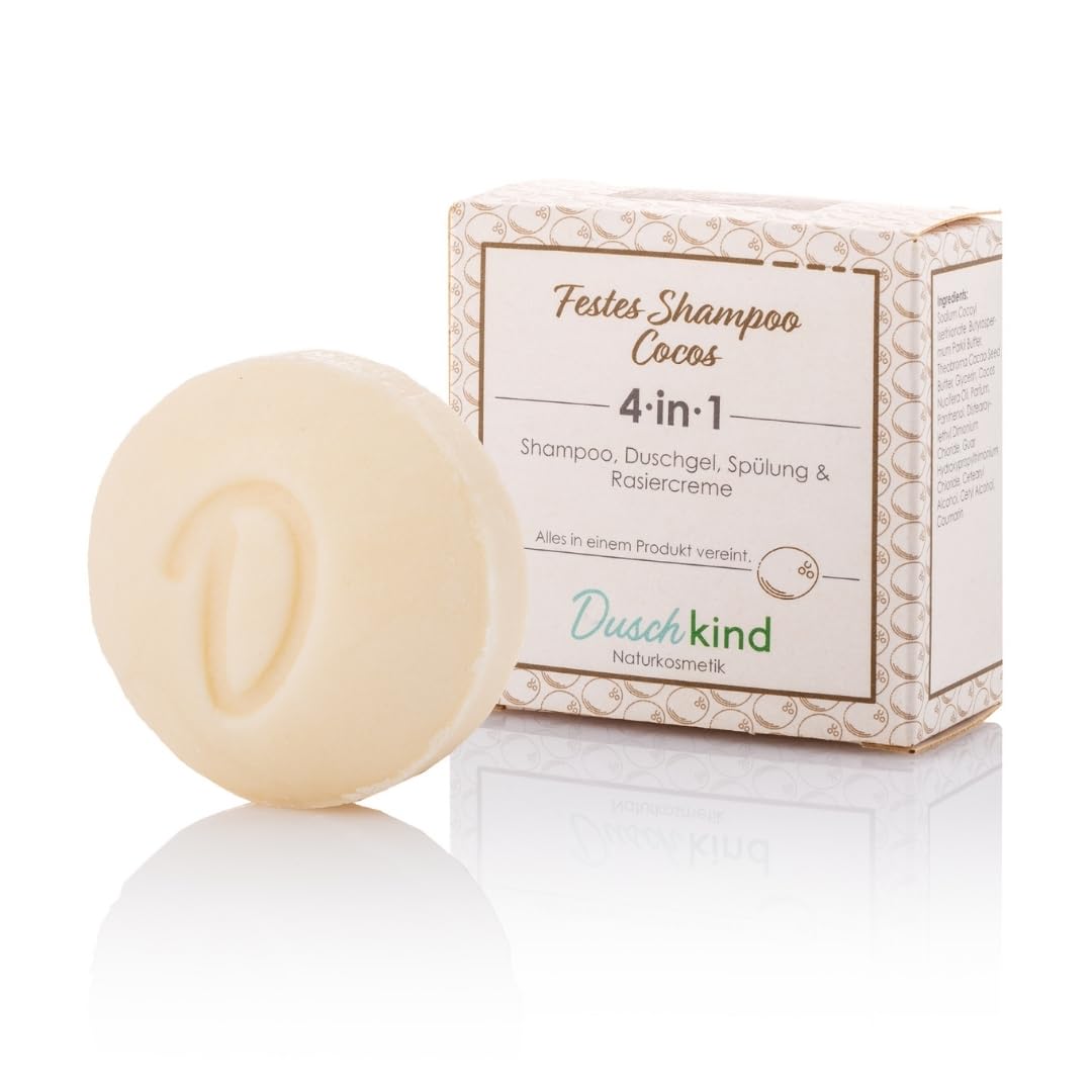 Duschkind 4-in-1 Solid Coconut Shampoo - 56g - Shampoo/Shower Gel/Conditioner/Shaving Cream - Coconut Oil & Natural Coconut Fragrance - Vegan Plastic-Free Handmade in Germany