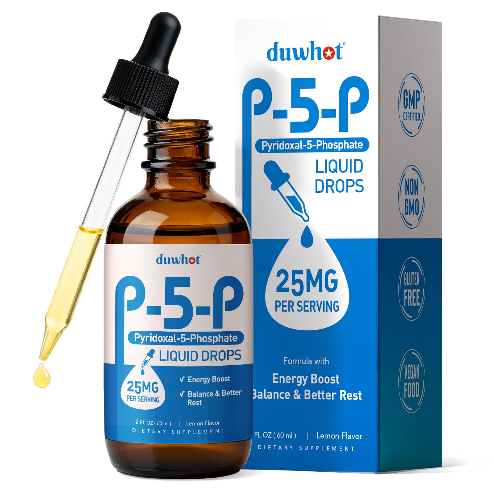 duwhot P5P Vitamin B6 25mg Pyridoxal-5-Phosphate Activated B6 Liquid Drops for Women & Men Energy Support Balance Nervous System Health 2 Fl Oz