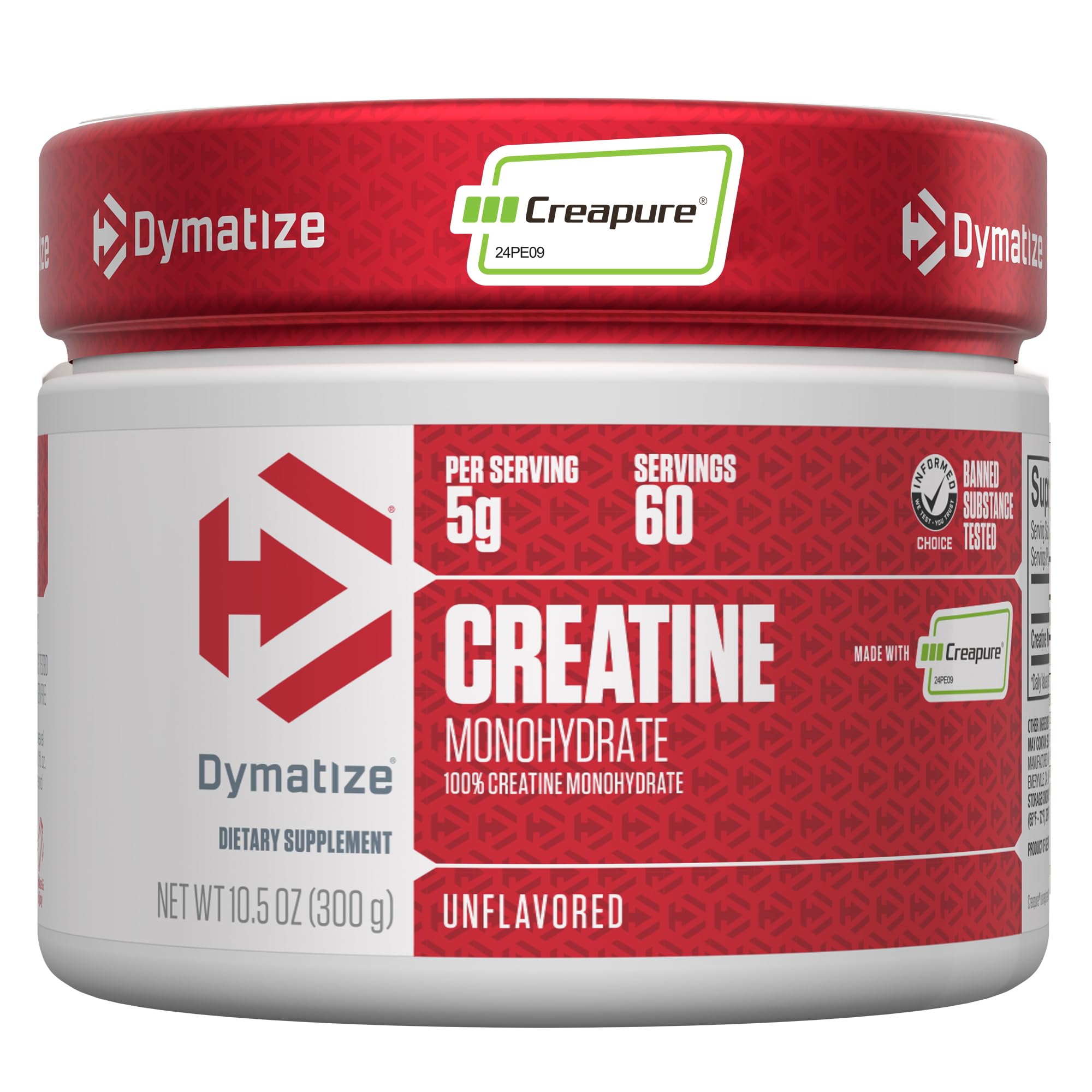 Fuel your performance with Dymatize Creatine Monohydrate, made with Creapure . Each 5g serving helps regenerate ATP, your body's primary energy source, to support strength, power, and lean muscle gains during high-intensity training. Backed by science and Informed Choice certified, it's a versatile supplement designed for both women and men at any fitness level. Unflavored and blends easily into water with no clumping or grit — making it a simple, effective addition to your routine.? †These statements have not been evaluated by the Food and Drug Administration. This product is not intended to diagnose, treat, cure, or prevent any disease.? ‡With routine exercise and strength training?With routine exercise and strength training. These statements have not been evaluated by the Food and Drug Administration. This product is not intended to diagnose, treat, cure, or prevent any disease. MIXES EASILY, NO GRIT: Unflavored and mixes effortlessly in water with no clumping or gritty texture, making it easy to include in any routine. FOR WOMEN MEN: A versatile performance supplement formulated to support strength and muscle building, for both men and women, no matter the training style, fitness goal, or experience level. BOOST YOUR POTENTIAL: Enhance your active lifestyle with our Creapure Creatine Monohydrate powder, designed to support your strength and performance goals. Each serving delivers a substantial 5 grams dose, catering to both fitness and wellness enthusiasts looking to push their limits. BOOSTS ENERGY PRODUCTION: Helps regenerate ATP, your body's main energy source, to power through intense workouts. Supports increase in muscle creatine phosphate, a critical energy source during high intensity muscle actions like weight training and sprinting. MADE WITH CREAPURE: Features creatine monohydrate, known worldwide for exceptional quality and purity. Ideal for serious athletes intending to increase high-intensity energy capacity and lean body mass during training.