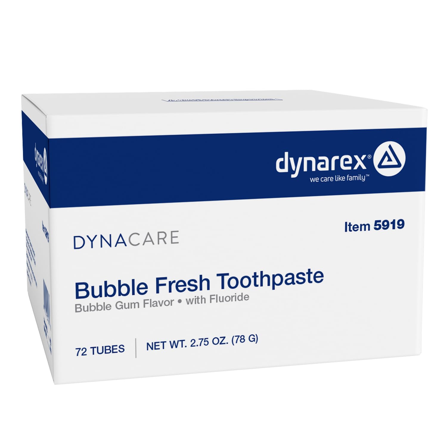 BULK PURCHASE POWER: Get a case of 72 - 2.75 oz tubes or just one tube of this bubblegum toothpaste for home or professional use in schools and care facilities. The DynaCare Bubble Fresh Toothpaste line offers various sizes and fluoride or fluoride-free options. GENTLE CLEANSING: This childrens fluoride toothpaste offers gentle cleaning for young teeth, promoting good oral health habits. Our toothpaste formula supports daily brushing to maintain a happy smile. Ideal for kids learning proper hygiene with a gentle, trusted product. BUBBLEGUM BLAST: This fun bubblegum toothpaste for kids makes brushing enjoyable, encouraging regular habits. The delicious taste appeals to children, turning oral care into a positive routine. It helps kids look forward to brushing twice daily for better dental health. CAVITY PROTECTION: This kids toothpaste contains fluoride to strengthen enamel and protect against cavities. Formulated for young children, it promotes healthy teeth and gums. Parents can trust its formula for daily dental care, ensuring long-term oral wellness. HAPPY SMILES: DynaCare Bubble Fresh Toothpaste uses trusted ingredients with bubblegum flavor to make brushing enjoyable for kids. It includes fluoride for cavity protection, promoting healthy teeth and gums, encouraging consistent oral hygiene habits.