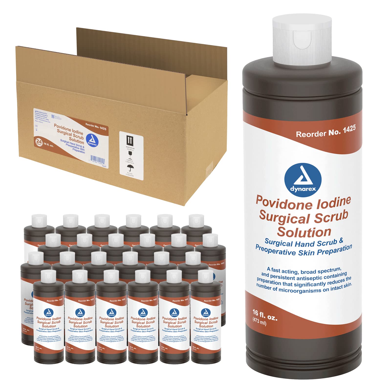 CONVENIENT PACKAGING: The Dynarex Povidone-Iodine Scrub Solution 16 fl. oz. bottles are shipped either individually or in a case of 24 bottles. Choose Dynarex Povidone Iodine Solution for medical facilities or your household supply. ATTACKS PATHOGENS: This solution works against a broad range of pathogens that may be resistant to other antiseptics. This topical antiseptic attacks pathogens effectively and stays on the skin or mucosa much longer than alcohol. MULTIPURPOSE: This Scrub Solution is mainly a preoperative antiseptic solution to prepare surgical sites. The povidone iodine content helps in treating and preventing wound infections, making it ideal for managing minor wounds as well. MEDICAL-GRADE FORMULATION: Each bottle contains 7.5 povidone iodine formula, U.S.P. equivalent to .75 available iodine. This topical solution is essential for healthcare professionals and ideal for households as well. EFFECTIVE ANTISEPTIC: The Dynarex Povidone Iodine Scrub Solution is an effective antiseptic solution used to treat skin abrasions, lacerations, and minor burns, and to prepare the skin and mucus membranes before a surgical procedure.