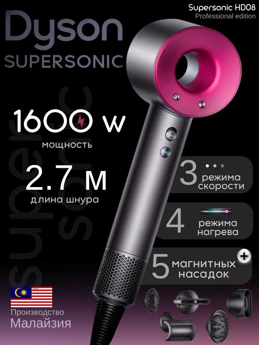 professional hair dryer for drying and styling hair makes a great gift for a woman, man, mother, or grandmother. This compact and powerful device is ideal for use at home or on the go thanks to its mini format and travel-sized attachment set with a comb. Designed with curly and straight hair in mind, it provides gentle drying without damaging the structure. This hairdressing tool allows you to easily create a variety of looks, from neat straightening to voluminous curls. Thanks to professional Dyson technology, the hair dryer produces a smooth and long-lasting style, while hair retains its natural shine and softness. Its compact size makes it convenient for travel, including from Malaysia and other countries. The attachment set expands its versatility—you can quickly change settings for different hair types and styling styles. This birthday gift for a woman, girlfriend, or friend will not only be useful but also a pleasant addition to your personal care routine. A mini hair dryer for men, whether young girls, adults, or men with any hair type. This analog of well-known professional models is reliable and easy to use. The device's powerful power ensures effective drying without overdrying the scalp. Even a novice user can easily operate this pink hair dryer thanks to its intuitive controls. This compact option is perfect for those who value quality in a compact format: at the cottage, on the road, or in the office, the device is always at hand. The gift set includes everything you need to create the perfect hairstyle effortlessly. By choosing this device for yourself or a loved one, you receive a multifunctional tool with a variety of settings and attachments. This 5-in-1 hair dryer is equally suitable for men with short haircuts and women with long hair of any type—from fine to thick curls. A great birthday gift for a sister.